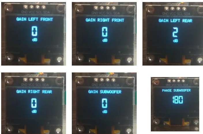 Перебор параметров осуществляется при помощи кнопки энкодера, переход во второе меню осуществляется при помощи кнопки SET. Кнопка INPUT переключает вход (по кругу от 1 до 3) и позволяет регулировать предусилитель входов. Кнопка MUTE отключает выходы аудиопроцессора, а кнопка POWER так же отключает выходы аудиопроцессора, а так же меняет состояние выхода STANDBY и полностью гасит дисплей.