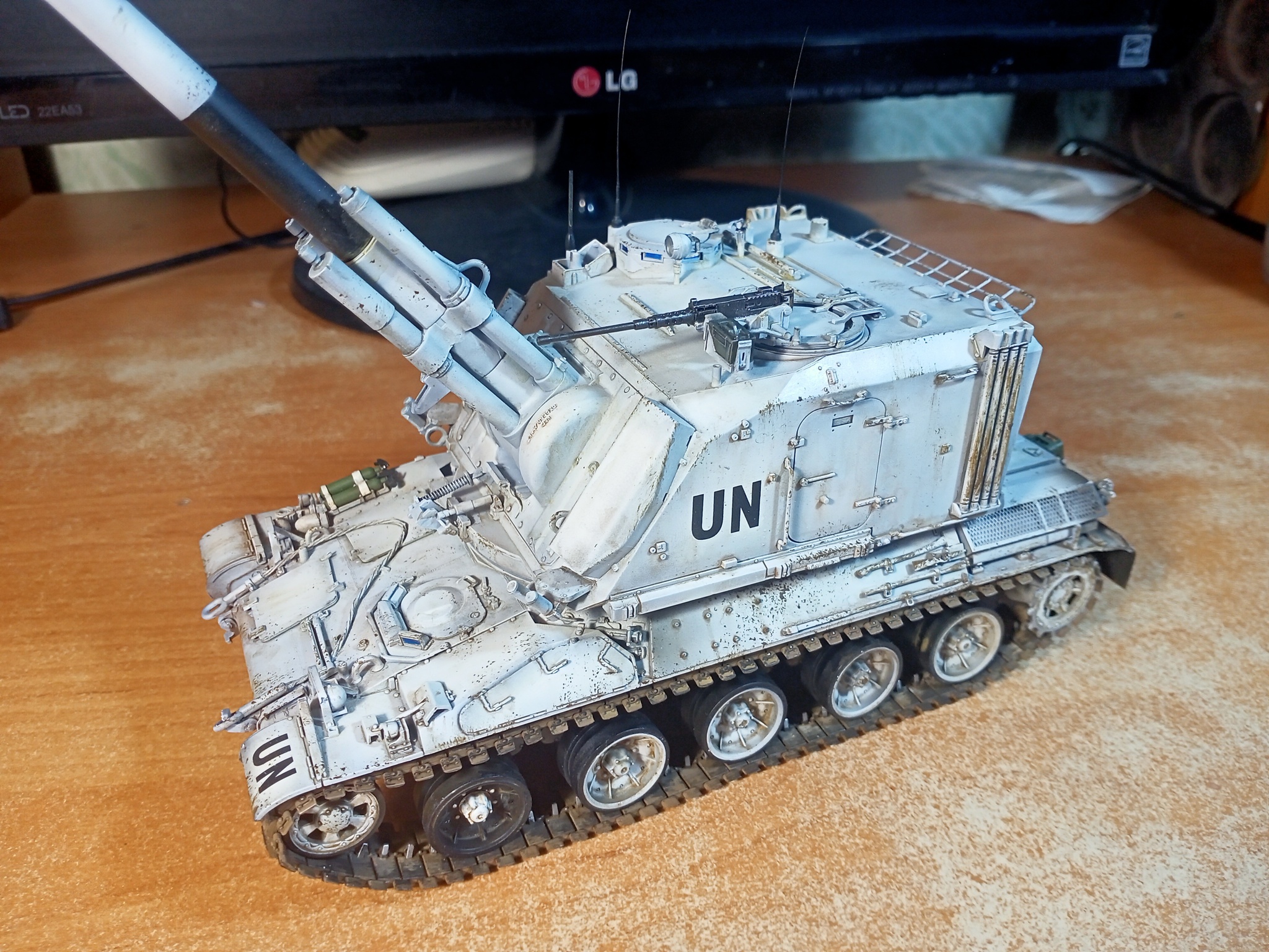 О наборе: набор 2015 года от китайской фирмы Meng в масштабе 1/35, основан на наборах 2014 года АМХ-30В2 и 2013 года AuF1, а те в свою очередь созданы на основе набора АМХ-30В 2012 года, который я и собирал ранее. И остался недоволен некоторыми аспектами. В коробке лежат целых 11 литников из тёмно-зелёного полистирола, также из этого пластика отдельно отлита ванна корпуса; 4 литника из чёрного пластика с деталями траков, 1 литник с прозрачными деталями, 1 литник с полиуретановыми втулками, пластинка фототравления, металлический тросик, кусочек проволоки, декаль и инструкция. В наборе целых 1085 деталей, впрочем 560 из них это элементы траков, да и неиспользованными останутся ни много ни мало 258. Качество литья неплохое - есть немного облоя, следы стыковки частей пресс-формы, обнаружена одна утяжина в весьма заметном месте. Пластик качественный, никаких нареканий. Детализация, как и на АМХ-30В, очень хорошая - от траков гусениц до зенитного пулемёта всё проработано очень достойно и выглядит замечательно. Модель не имеет интерьера, в отличии от набора 2013 года, где у подобной самоходки полностью дан интерьер башни. Стыкуемость стремится к идеальной, как и должно быть у Менга. Фототравление не слишком обильное (8 деталей), но очень качественное и хорошо повышает зрелищность модели. Порадовал металлический тросик, которого не было в танке. А вот 3 см проволочки могли и не давать - думаю такое богатство найдётся у любого человека! Прозрачные детали чистые и аккуратные, но только почти в полном составе отправятся в запас - нам понадобятся только стёкла для фар и прожектора и два смотровых прибора в бортах башни. Перископы мехвода и командира даны из обычного пластика. В наборе рабочие гусеницы, а также полностью рабочая ходовая с действующими торсионами! И, в отличие от танка, тут всё это прекрасно работает! Дело в том, что у АМХ-30В и AuF1 цельнометаллическая однопальцевая гусеница, и её модельная версия оказалась очень хлипкой и распадалась от собственного веса. А вот у более поздних АМХ-30В2 и AuF1 TA уже гусеница с параллельным шарниром, и её модель замечательно работает и держится в сборе, правда собирается совсем не легко. Набор имеет очень ограниченную вариативность по сборке: можно выбирать из двух типов фар и габаритных огней и зачем-то открыть люки пустой башни. Бонусов в наборе нет. Инструкция - книжечка с замечательной исторической статьёй о прототипе, которая очень пригодилась мне при написании своей исторической статьи. По сборке всё наглядно, понятно и очень красиво. Схемы окраски цветные, машина показана с 4 или 5 проекций (отлично для камуфляжа!), указана принадлежность машин к части, местность и год. Выбираем из двух вариантов: белая САУ контингента ООН в Ливане или машина в стандартном трёхцветном камуфляже НАТО, служившая во Франции. Особенность, встречающаяся иногда у Менга - декали даны на большее количество вариантов, чем дано в инструкции. Наверное, это такой квест для моделистов про-уровня - найди прототип, который нёс эти обозначения, и делай. Например, в этом наборе есть "лишние" обозначения UN и крупный красочный герб какой-то артиллерийской части в виде щита с парой перекрещенных пушек. Декаль прекрасного качества, тонкая и яркая. Цена модели выше среднего, заметно ниже набора AuF1 с интерьером башни. Могу рекомендовать моделистам среднего уровня и выше, п