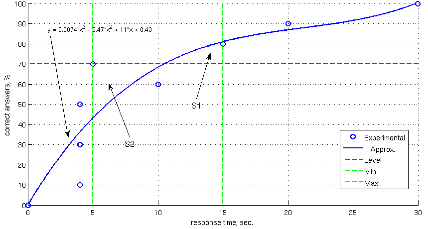 Графическое представление характеристики для умений и навыков как функции корректности выполняемых действий от затраченного времени
