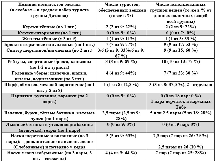 По таблице видно, насколько плохо были одеты дятловцы и вся их группа по тем условиям, в которые они попали после выхода из палатки. Особенно плохим состояние группы было в части оснащения головными уборами, перчатками и рукавицами, носками и обувью. Большая часть группы не имела тёплой верхней одежды – курток и телогреек. Конечно, несколько мелких вещей были утрачены уже после выхода из палатки, при отступлении и во время борьбы в лесу. Но всё же, конечное состояние вещей определённо характеризует оснащение группы, попавшей в экстремальные условия ночного урагана, как катастрофическое: большая часть вещей осталась в палатке. И это состояние вещей определённо указывает на замерзание, как на главную причину гибели группы в условиях ночной тайги при сильном морозе и ветре.