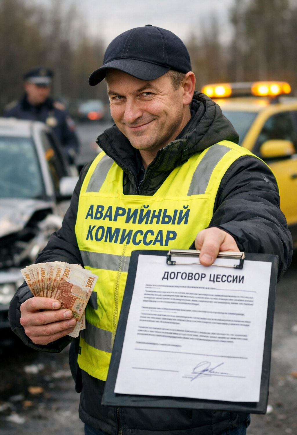 Дорожно-транспортное происшествие как раз из этой серии, и когда рядом вдруг появляется облаченный в светящуюся форму некто, с успокаивающей надписью "Аварийный комиссар" на спине, многие могут довериться словам этого умудрённого опытом специалиста. К тому же на его автомобиле желтые проблесковые маячки, и с приехавшими инспекторами он здоровается за руку.