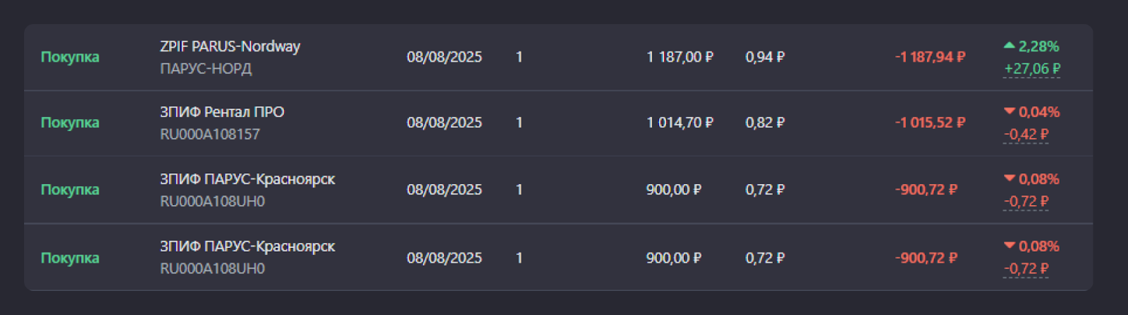 У меня было по 1 паю Рентал ПРО, Парус ЛОГ и СБЛ. Я продолжил диверсифицироваться и взял новые для меня Парус-Красноярск + Парус-НОРД. Красноярска аж две штуки. Не ищите тут какую-то супер идею, просто он по 900 рублей, и на другие не хватило бы уже, чтобы взять второй пай. Также взял Рентал ПРО, их теперь у меня тоже 2.