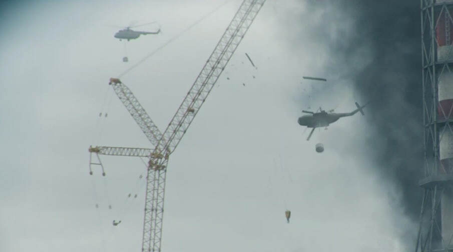 Первый вертолёт выполнил сброс без происшествий. Второй, проходя над зданием реактора, задел винтами тросы строительного крана. Лопасти разрушились, и машина рухнула у подножия энергоблока. Съёмочная группа засняла момент катастрофы.