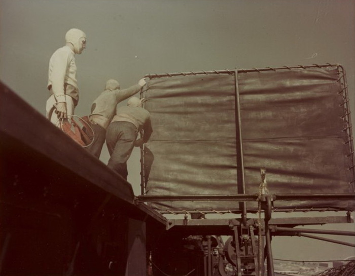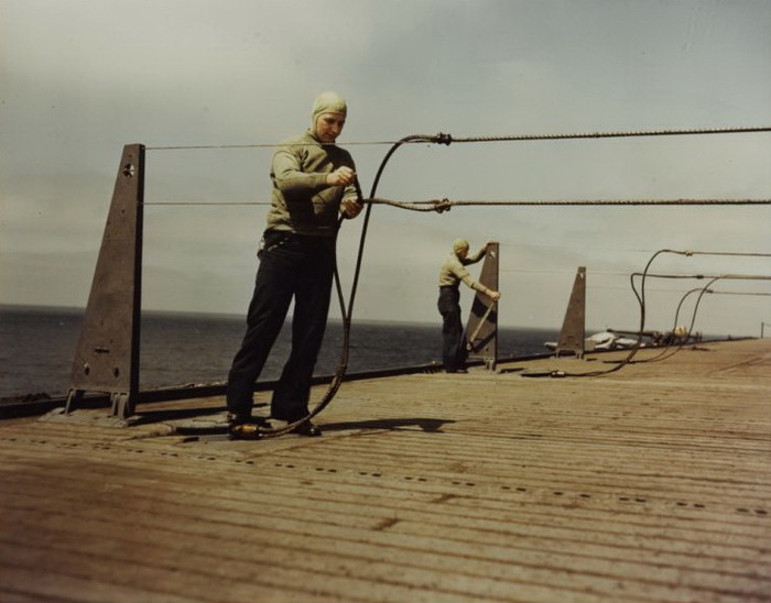 Получив команду руководителя полетами, командир корабля или вахтенный офицер менял курс и скорость авианосца таким образом, чтобы корабль шел строго против ветра и с заданной скоростью относительно воздушного потока, например, 31 узел (57,5 км/ч). Эта скорость с помощью табличек указывалась на ограждении поста, а также дублировалась сигнальными шарами на мачте. Одновременно с этим сигнальщик-прожекторист (справа) передавал блинкером команду эсминцу-«спасателю» занять позицию в кильватере авианосца. Задачей этого корабля было спасение экипажей в случае аварийных посадок, сопровождавшихся падением с полетной палубы в воду. После выполнения всех этих мероприятий красный флаг на посту управления полетами менялся на зеленый, разрешающий самолетам посадку.