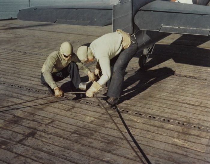 И последнее, что на этом этапе должны были сделать члены «синей команды», – это осуществить «промежуточное» крепление самолета. Первым делом под колеса шасси устанавливались деревянные стояночные колодки, а затем машину принайтовывали к палубе. На самолете найтовы пропускали в специальные проушины или рымы, крепившиеся к лонжерону центроплана или плоскости, а вот сама система креплений на палубах американских авианосцев в связи с переходом на палубную парковку претерпела серьезные изменения. Если на ранних авианосцах, до «Лексингтонов» включительно, узлы крепления были врезаны в палубный настил «по сетке» с шагом около 1,5 м, примерно так же, как и на британских и японских авианосцах, то, начиная с CV-4 «Рейнджер», их заменили стальные полосы, идущие поперек полетной палубы от борта до борта с шагом в 4-8 футов (1,2-2,4 м), в зависимости от корабля. В этих полосах по всей их длине были прорублены фигурные отверстия, образовывавшие заглубленные такелажные «утки», к которым и крепились найтовы.