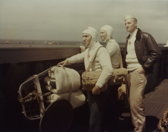 Кроме собственно палубной команды в «комитет по встрече» входила медицинская группа в составе главврача авиагруппы (Flight Surgeon) и старшин-санинструкторов, форма одежды – белые свитера и шлемы с красными крестами спереди и сзади. Группа была укомплектована всем необходимым для оказания первой помощи и эвакуации раненых в воздухе или получивших травмы при посадке летчиков. Еще одной специализированной группой были пожарные-спасатели (Fire Rescue Crew) или «горячие папочки». Спасатели – потому что их первоочередной задачей в случае аварии с возгоранием было первыми взобраться на горящий самолет и обеспечить эвакуацию экипажа, а затем возглавить борьбу с огнем на самых опасных участках. Специальной формы у них не было – огнезащитные асбестовые костюмы и маски достаточно выделялись и без этого.