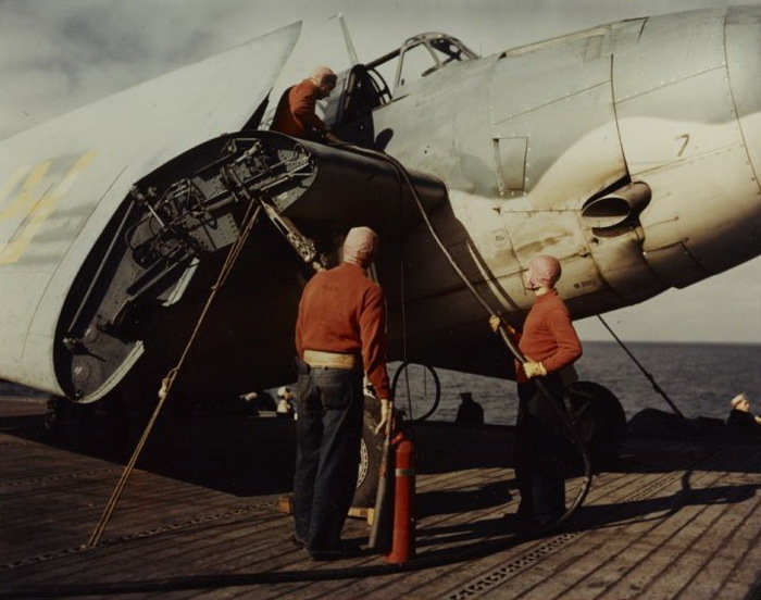 Если севшему самолету вскоре предстоял следующий вылет, то за него сразу же брались члены палубной команды, отвечавшие за предполетное обслуживание. Это были заправщики (Aircraft Refueling Crew), одетые в свитера и шлемы красного цвета и оружейники (Aircraft Ordnance Crew) в белых свитерах и красных шлемах с черной полосой. Заправщики тащили с собой заправочный шланг и огнетушитель, а оружейники – контейнеры с пулеметными лентами. Более тяжелые боеприпасы – бомбы, ракеты и торпеды – подавались из боевых погребов на палубу с помощью подъемников боеприпасов (обычно в районе надстройки-«острова») и перемещались на специальных тележках. Хотя и контейнеры с лентами были далеко не пушинками, например, если речь идет о боекомплекте для крыльевых пулеметов «Уайлдкета», то в каждом из них находится лента на 430 патронов калибра 12,7-мм. Любой, кому в армии приходилось таскать ленты для ДШК или «Утеса» (всего по 50 патронов), может прикинуть, сколько это весило.