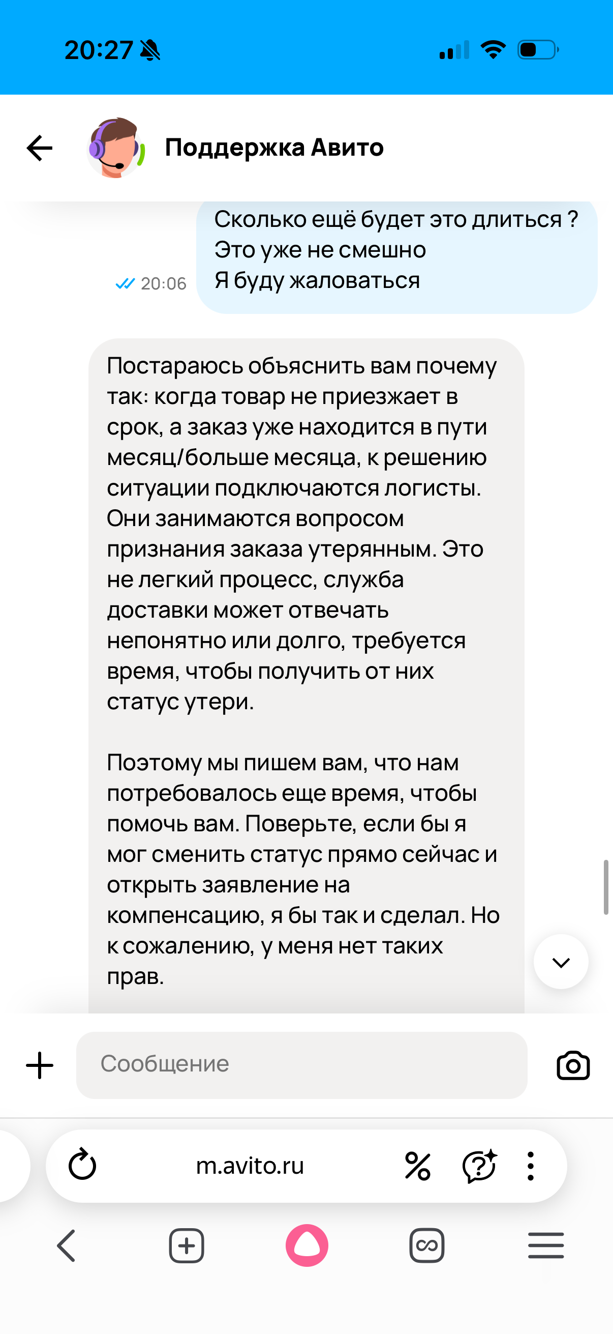 Заказ в пути с 3 декабря,от авито постоянные отписки что ищут,сегодня уже 17 января,обещали компенсацию 7.01,так графы этой и не появилось,сказали ещё рассматривать неделю будут,сегодня 17.01 статус не меняется,компенсации нет