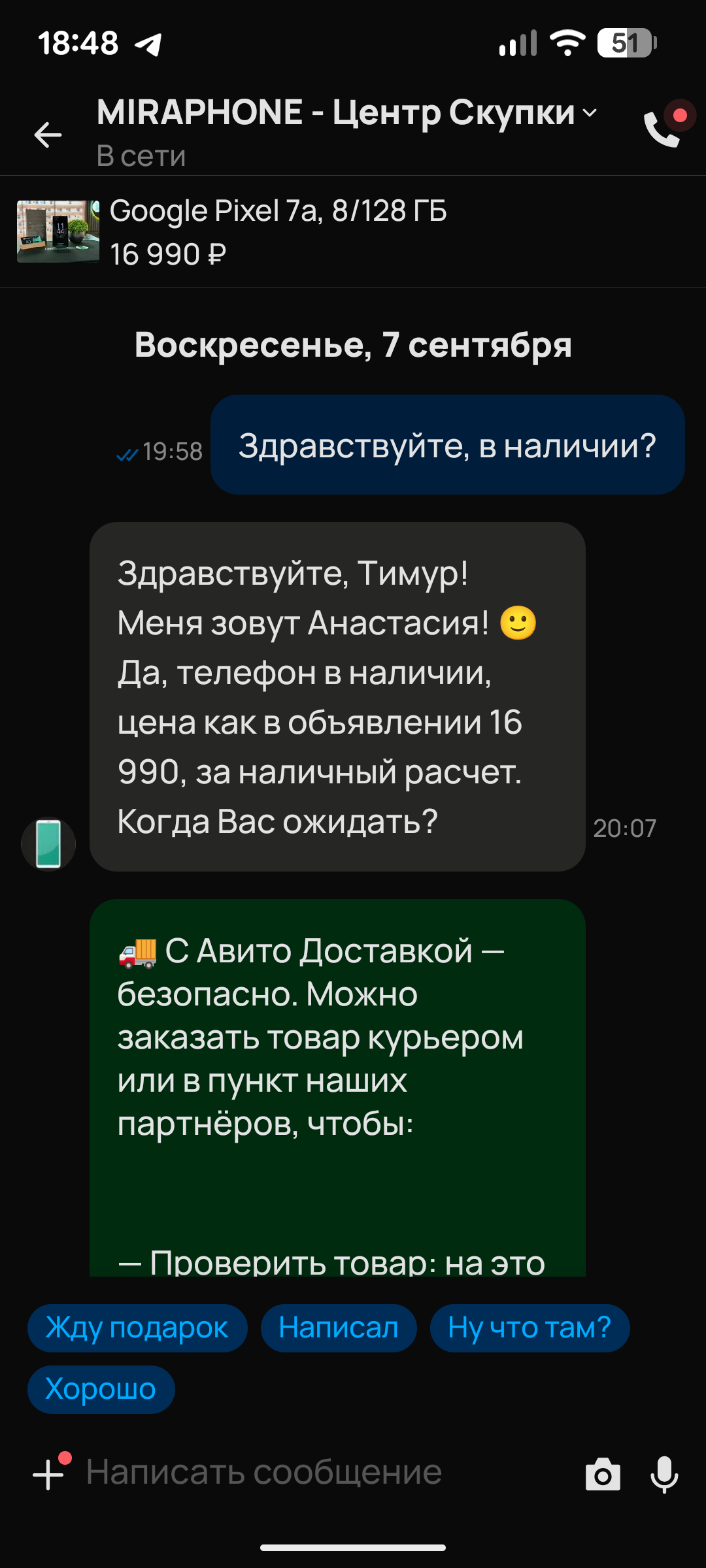 Дело было так, нахожу объявление в Авито от магазина, решил написать актуально ли оно, т.к. цена меня устраивала. В ответ получаю: