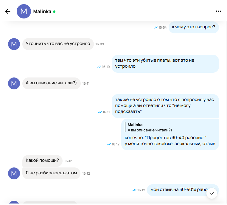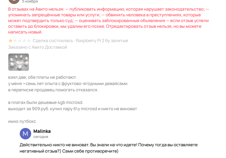 как итог - я в минусе с двумя мертвыми платами, мой отзыв заблокировали и я опасаюсь что этот продаван и дальше продолжит эксплуатировать алгоритмы авито что бы меня заблокировали.