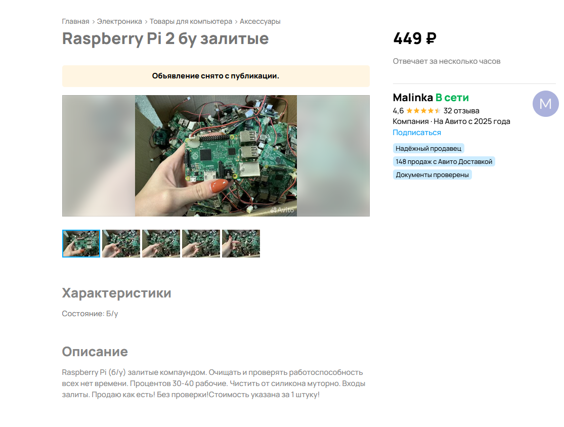 Для ЛЛ - купил две залитые компаунд это многокомпонентная полимерная смесь с добавками, используемая для герметизации, изоляции и защиты различных изделий. Raspberry Pi 2 по итогам получил убитые платы, просил помощи продавца - не получил. написал отзыв, а дальше магия авито, отзыв опубликовали а после террора продавана, отзыв заблокировали а техподдержка игнорирует.