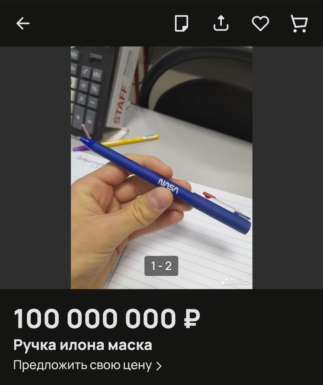 1 Moringotto0 Наука Авито Дичь#28 2 года назад [моё] Авито Дичь Ручка NASA Илон Маск Объявление Скриншот Ещё 0