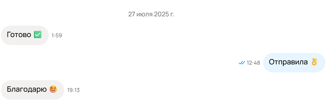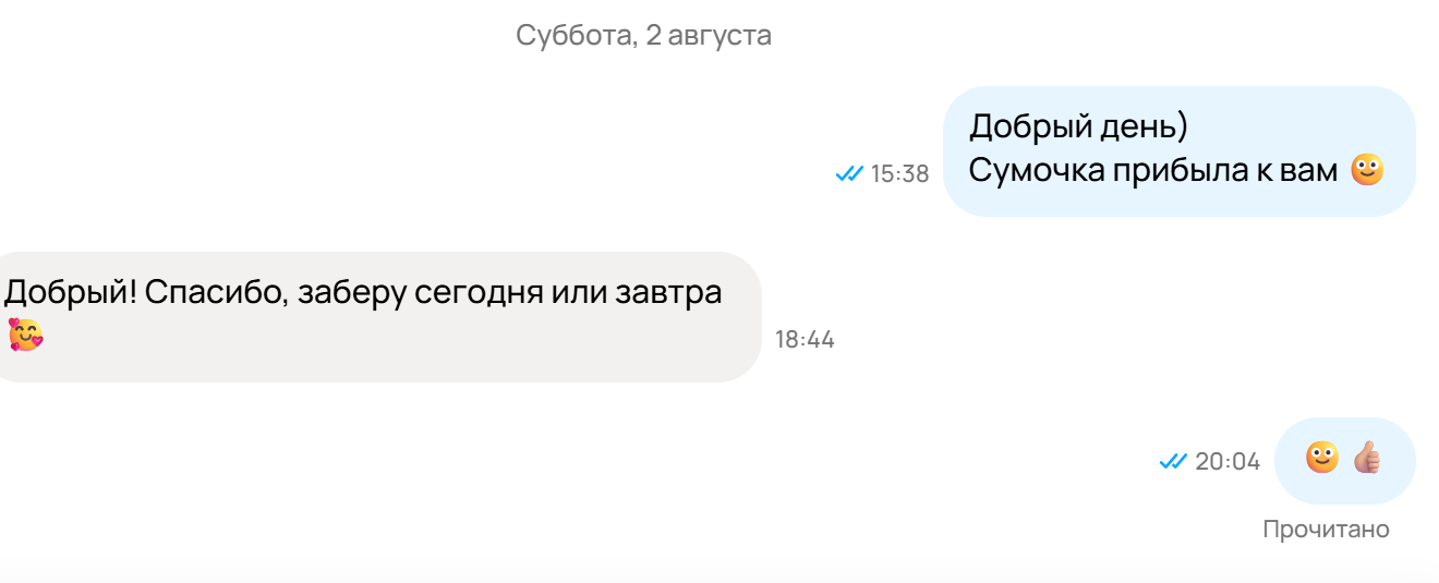т.к. девушка оформляла заказ не с основного аккаунта, я решила дополнительно ее уведомить, что сумочка доставлена, на что получила ответ: