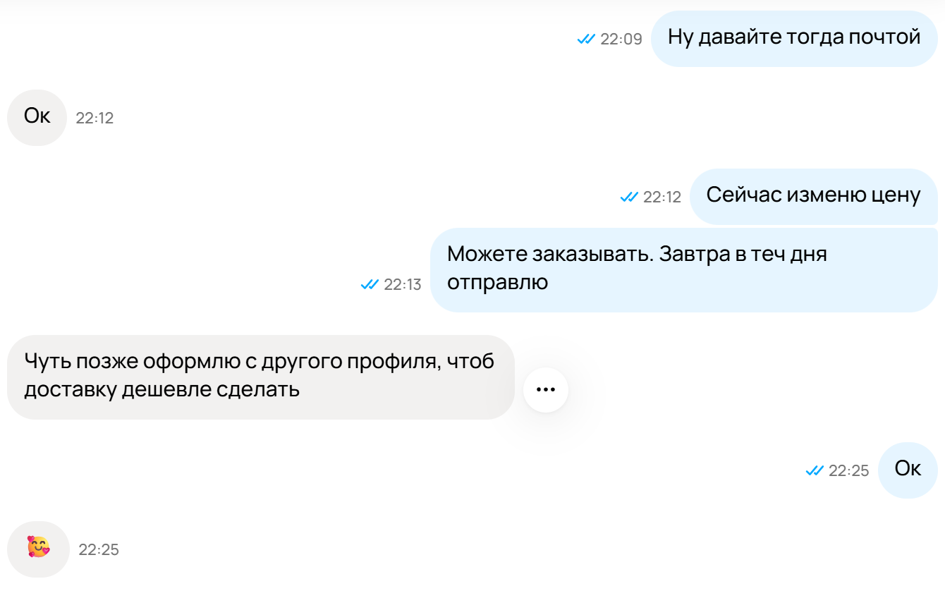 Чуть больше недели назад мне написала девушка с предложением снизить цену на несколько тысяч, после чего она оформит доставку. Мы немного пообщались, сошлись на средней цифре и "ударили по рукам".
