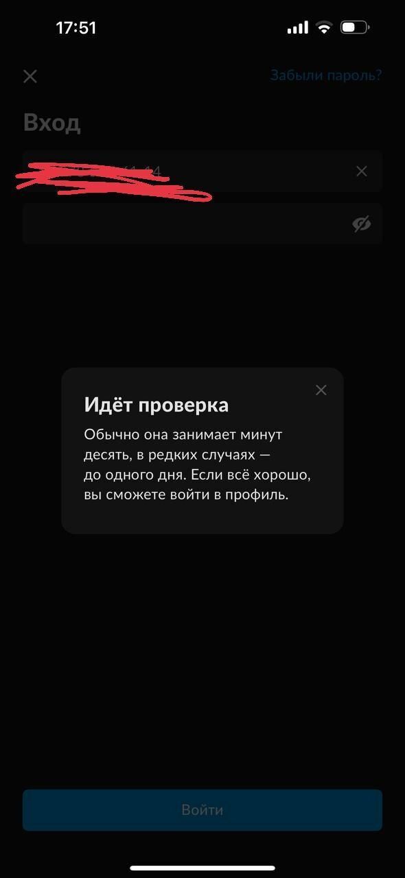 Поняв что можно продолжать работу, я начала заходить в аккаунт, но при входе всё также появляется уведомление «Идёт проверка, обычно она занимает пару минут, но в редких случаях до одного дня»