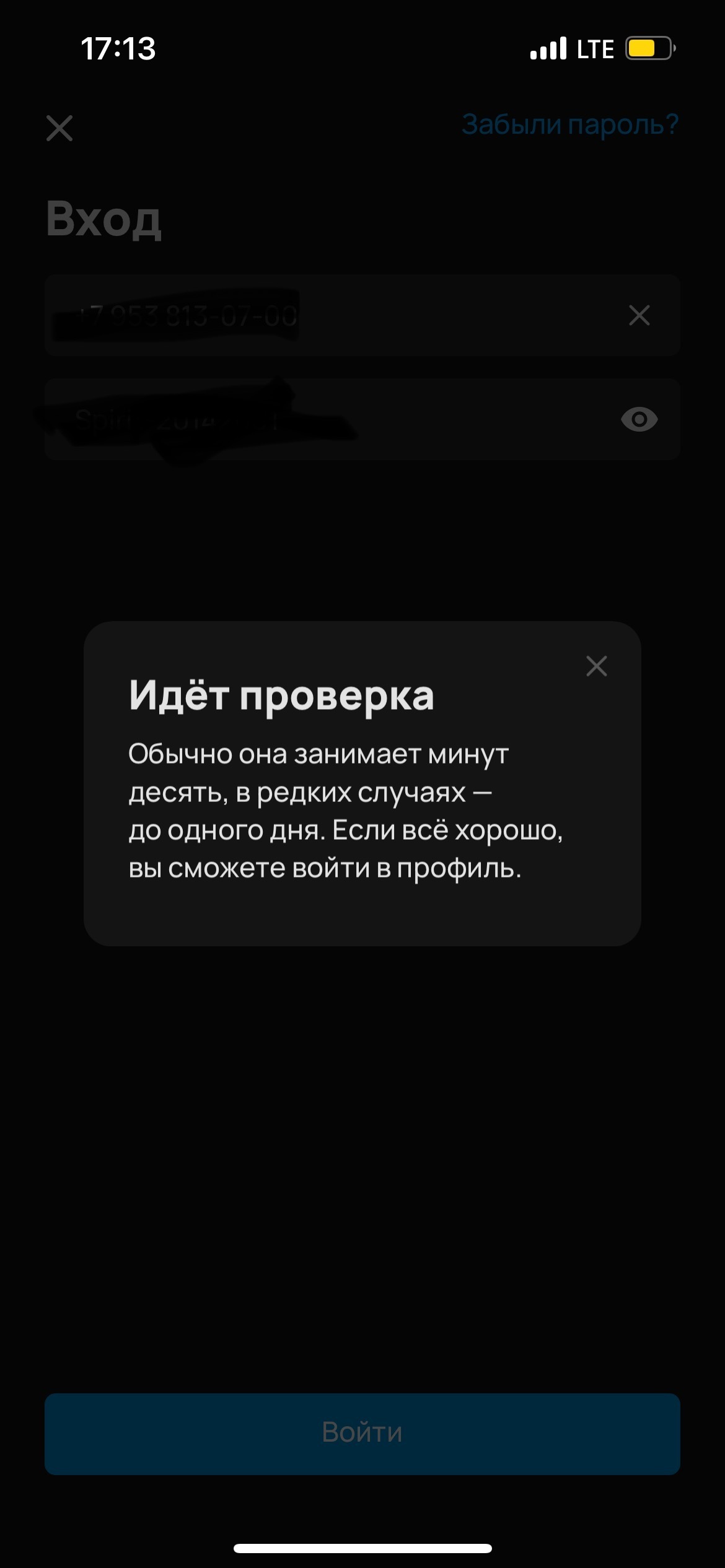 Поняв что можно продолжать работу, я начала заходить в аккаунт, но при входе всё также появляется уведомление «Идёт проверка, обычно она занимает пару минут, но в редких случаях до одного дня»