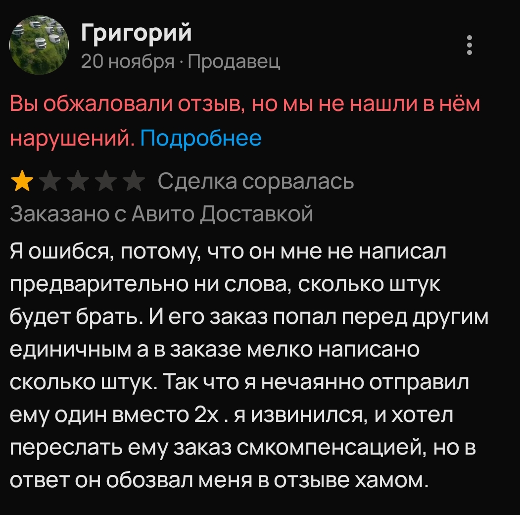 Этот хрен в своем отзыве пишет СВОИ косяки и врет, ни о какой компенсации и речи не шло. Поддержке авиты похую, как и во всех остальных случаях у других людей. Авита, ну что за нулевая поддержка, почему служба работы с клиентами такое говно, почему вы нихрена не проверяете, а только берете деньги с людей? Есть же факты, переписка. Да тут вообще ничего даже проверять не надо - этот тип ставит единицу за свои же действия.