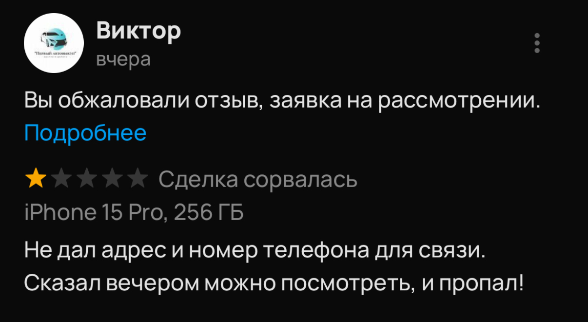 Здесь Авито быстро обработали запрос продавца и можно сказать «убрали этот отзыв».