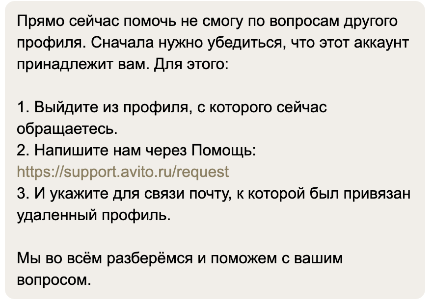 Еще раз вкратце - Авито блокирует мой профиль, заставляет верифицировать новый, потом восстанавливает заблоченный и удаляет новый. Но. Верифицировать восстановленный профиль я не могу - потому что уже верифицировал удаленный. Пардон если сложно, старался как мог.