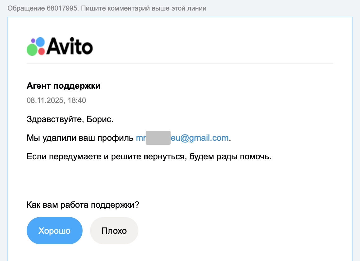 И, о чудо! Авито просто взяли и удалили мой профиль без всяких подтверждений что именно я его владелец.