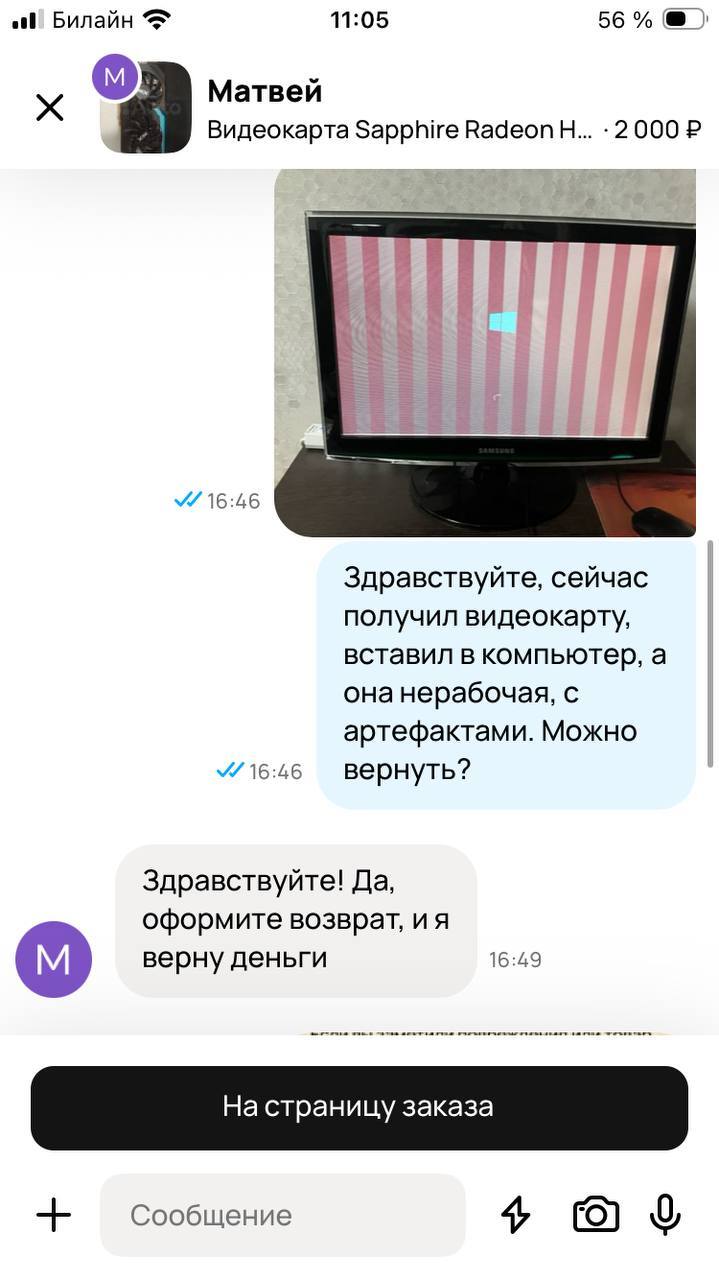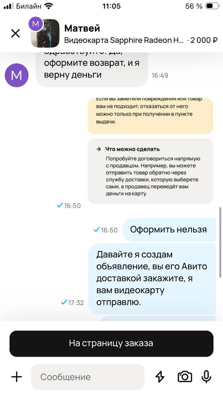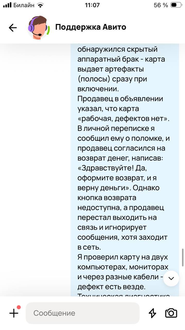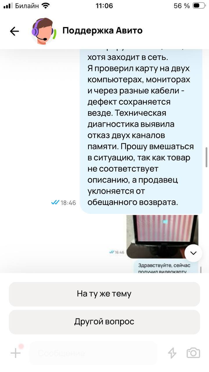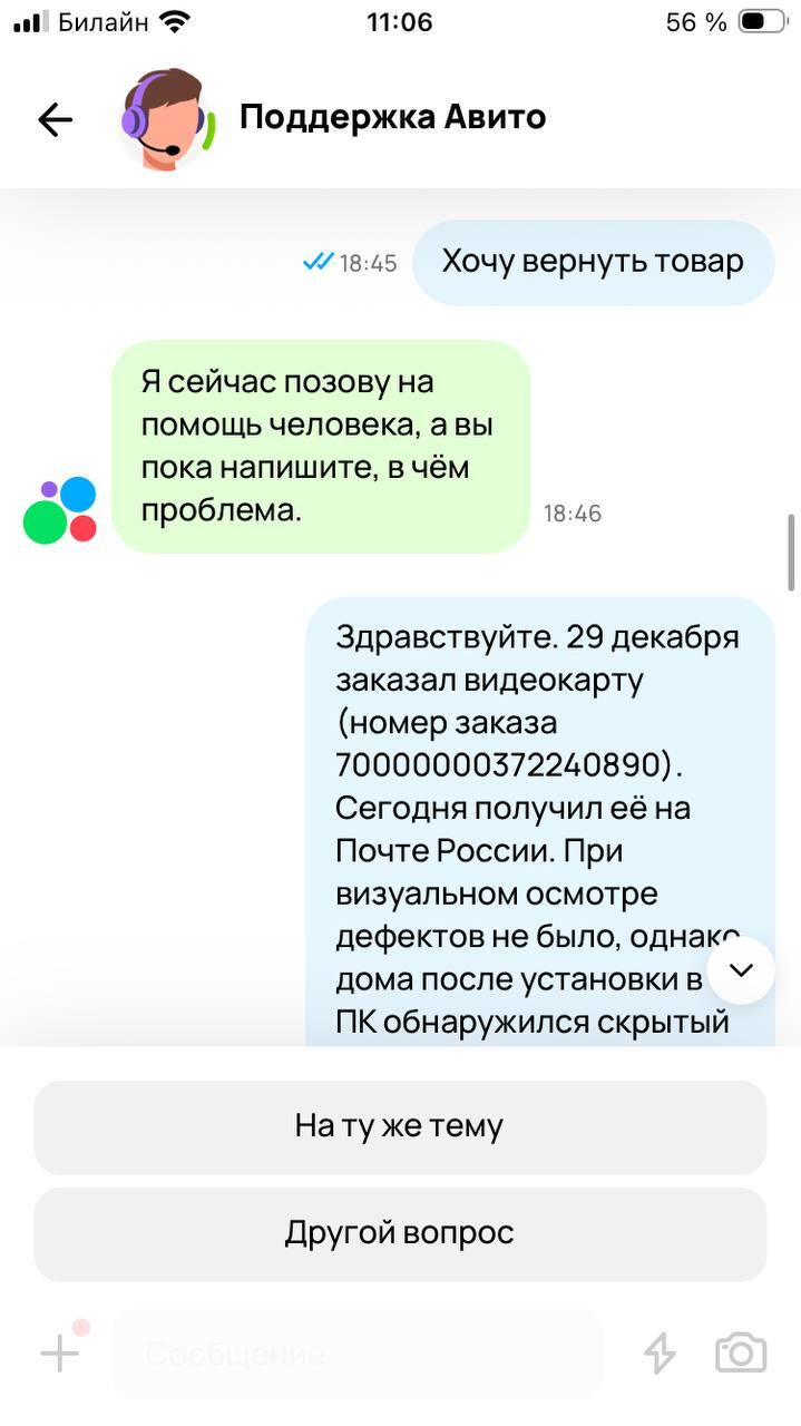 Короче, была у меня проблема - случился отвал на видеокарте. Вот я и решил себе сделать подарочек на НГ и заказать с Авито карту HD 7870 за 2000 рублей. Ну и я её заказал, получил, на почте осмотрел - на вид чистая, красивая. А дома её вставил в компьютер, а там - отвал. Пробовал с разными компьютерами, мониторами, кабелями, отвал везде. Через TSERVER сделал тест памяти, и он выявил два проблемных канала B0 и B1. Это явно аппаратный дефект, а не кривые драйвера или система. Я, естественно, написал продавцу в личку с просьбой о возврате. Он как порядочный человек, согласился, сказал нажать на кнопку и оформить возврат. Только вот оформить возврат нельзя уже по правилам авито - если я её с почты забрал, значит, никаких возвратов, потому что заказ завершён. И ладно вводить такие правила к какой-нибудь одежде: дырку или заплатку можно и на почте увидеть. Но к видеокартам и остальным компьютерным комплектующим... Её на почте никак проверить нельзя, только если воткнуть в компьютер. И даже если бы я притащил компьютер на почту - всё равно бы воткнуть не разрешили бы. После этого всего я написал в поддержку, они там сказали заполнить заявление на компенсацию. Я его заполнил, со всеми фотками и видео доказательств. И сегодня утром беру телефон, открываю авито, и вижу ОТКАЗ!!! Написано, что не могут убедиться, что это произошло при доставке или вообще то что не я её сломал. После этого я ещё раз обратился в поддержку и подробнее описал, что на почте её никак проверить нельзя. И через минут 10 - ещё один отказ. То есть авито недобросовестного продавца, который, скорее всего, изначально знал про дефект (так как в объявлении не было ни одного фото включенной видеокарты и то что он ушёл в игнор после просьбы о возврате) кормит, перечисляет мои 2000, блокировать мошенника не хотят, а меня просто посылают куда подальше и оставляют с потерянными двумя тысячами и нерабочим куском текстолита. Авито, вы там не ох*ели? У нас вроде бы как все борются с мошенниками, только вот авито их ещё и поощряет. Просто дурдом какой-то...