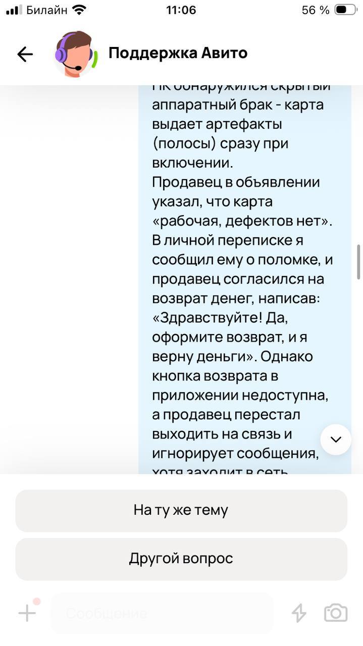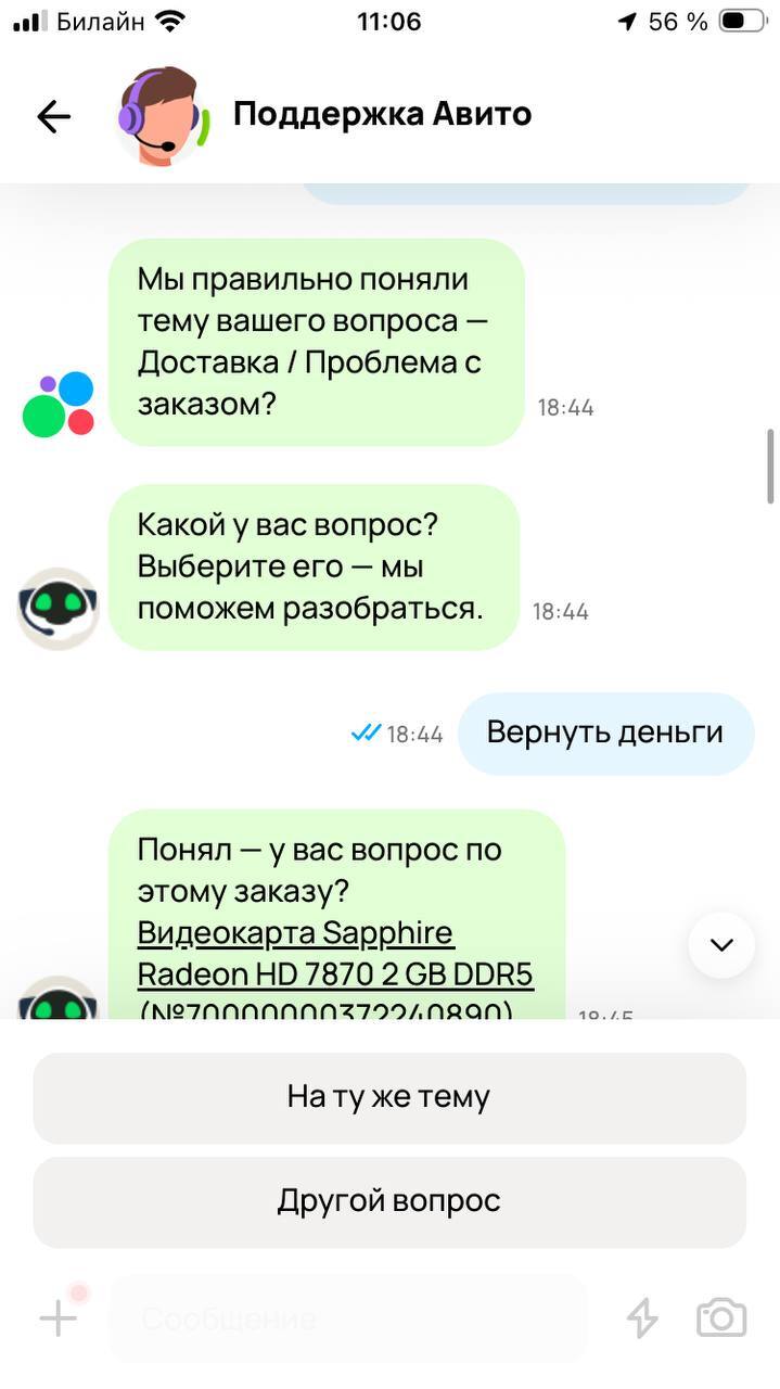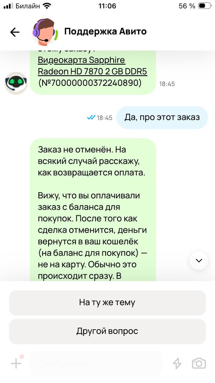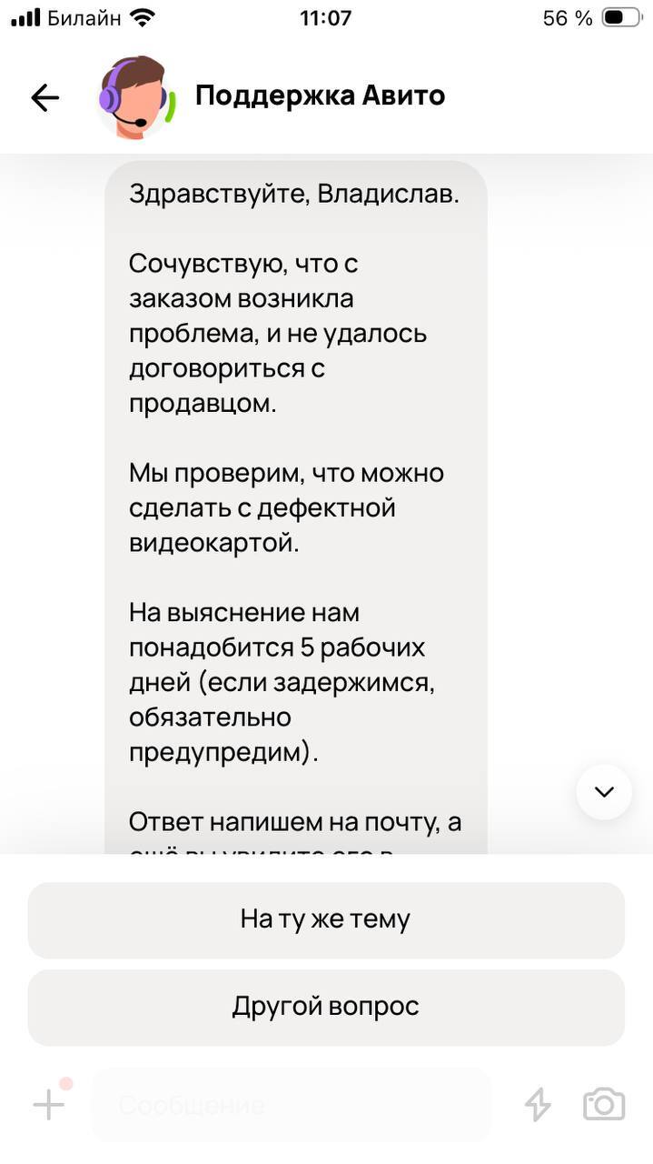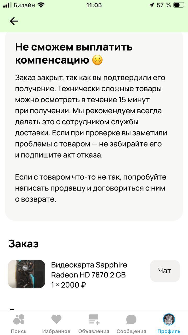 Короче, была у меня проблема - случился отвал на видеокарте. Вот я и решил себе сделать подарочек на НГ и заказать с Авито карту HD 7870 за 2000 рублей. Ну и я её заказал, получил, на почте осмотрел - на вид чистая, красивая. А дома её вставил в компьютер, а там - отвал. Пробовал с разными компьютерами, мониторами, кабелями, отвал везде. Через TSERVER сделал тест памяти, и он выявил два проблемных канала B0 и B1. Это явно аппаратный дефект, а не кривые драйвера или система. Я, естественно, написал продавцу в личку с просьбой о возврате. Он как порядочный человек, согласился, сказал нажать на кнопку и оформить возврат. Только вот оформить возврат нельзя уже по правилам авито - если я её с почты забрал, значит, никаких возвратов, потому что заказ завершён. И ладно вводить такие правила к какой-нибудь одежде: дырку или заплатку можно и на почте увидеть. Но к видеокартам и остальным компьютерным комплектующим... Её на почте никак проверить нельзя, только если воткнуть в компьютер. И даже если бы я притащил компьютер на почту - всё равно бы воткнуть не разрешили бы. После этого всего я написал в поддержку, они там сказали заполнить заявление на компенсацию. Я его заполнил, со всеми фотками и видео доказательств. И сегодня утром беру телефон, открываю авито, и вижу ОТКАЗ!!! Написано, что не могут убедиться, что это произошло при доставке или вообще то что не я её сломал. После этого я ещё раз обратился в поддержку и подробнее описал, что на почте её никак проверить нельзя. И через минут 10 - ещё один отказ. То есть авито недобросовестного продавца, который, скорее всего, изначально знал про дефект (так как в объявлении не было ни одного фото включенной видеокарты и то что он ушёл в игнор после просьбы о возврате) кормит, перечисляет мои 2000, блокировать мошенника не хотят, а меня просто посылают куда подальше и оставляют с потерянными двумя тысячами и нерабочим куском текстолита. Авито, вы там не ох*ели? У нас вроде бы как все борются с мошенниками, только вот авито их ещё и поощряет. Просто дурдом какой-то...