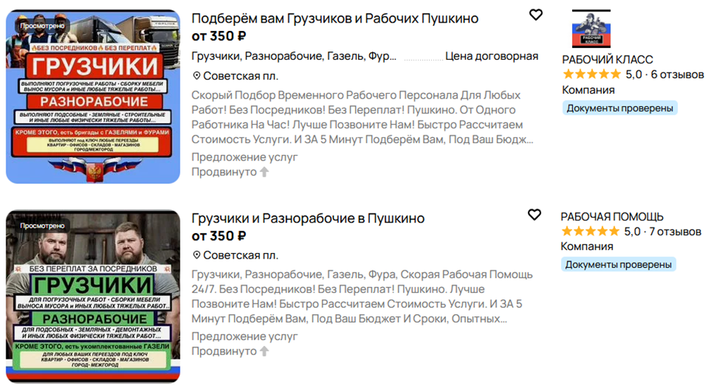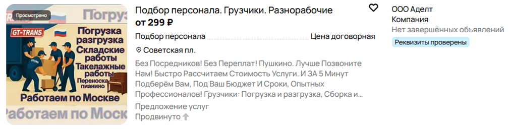 В свободное время на работе провел небольшое расследование и выяснил что у этих мошенников куча объявлений на авито, причем они явно нарушают правила площадки (видимо персональный менеджер покрывает), полно дублей объявлений и недостоверная информация в тексте объявления (своих рабочих у них нет они их находят по чатам и затем кидают)
