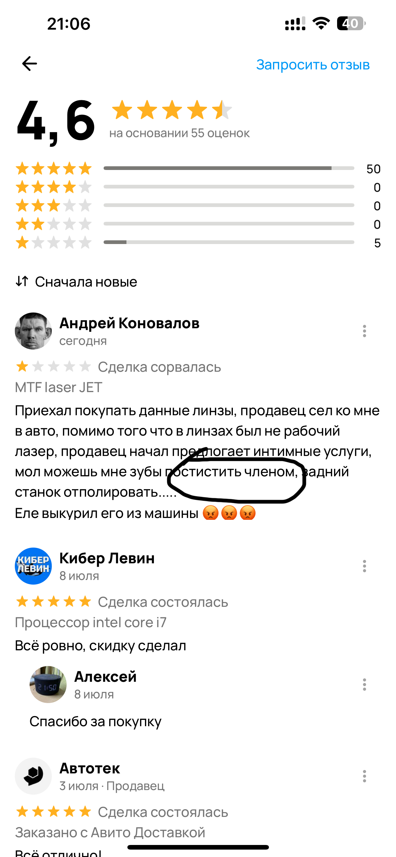 Через пару часов он написал негативный отзыв что со мной сложно договориться и позвонить (хотя номер телефона он не спрашивал)
