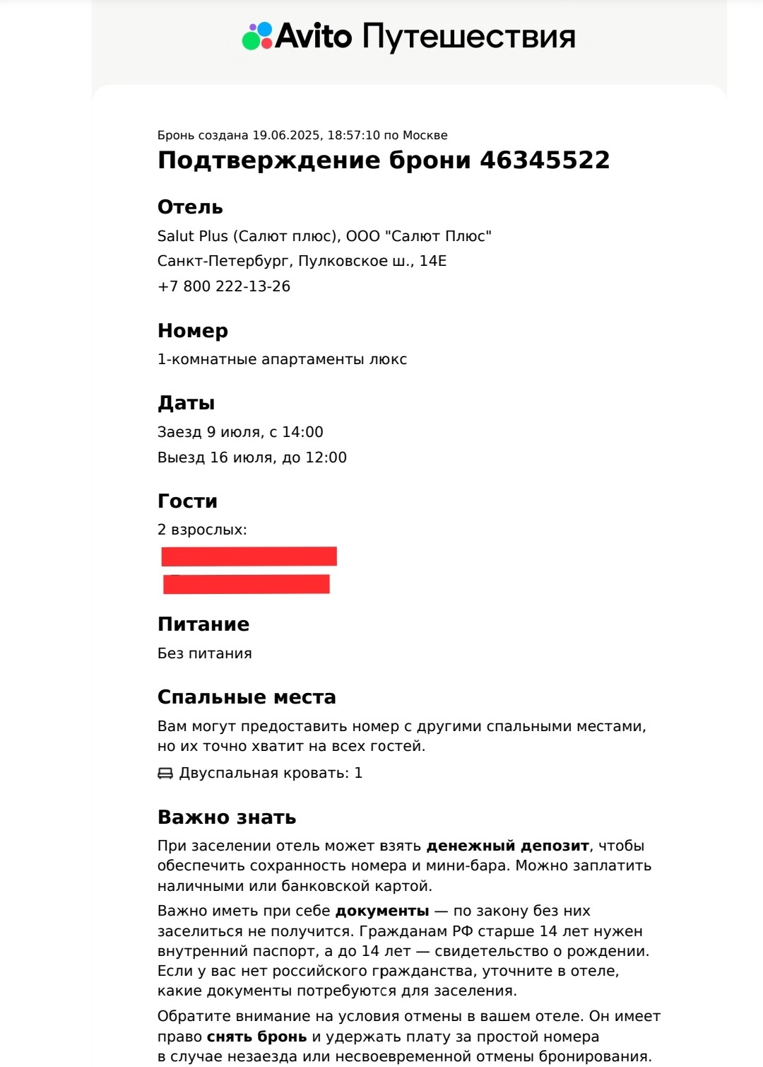 В июле 2025 года я собрался в отпуск в город Санкт-Петербург и забронировал номер в отеле "Салют Плюс" через Авито с 9 по 16 июля 2025 года на сумму 28 500 рублей. Особое внимание уделяю категории номера: 1-комнатные апартаменты. Отель не смог нам предоставить номер данной категории, что Авито игнорирует и деньги возвращать никто не собирается.