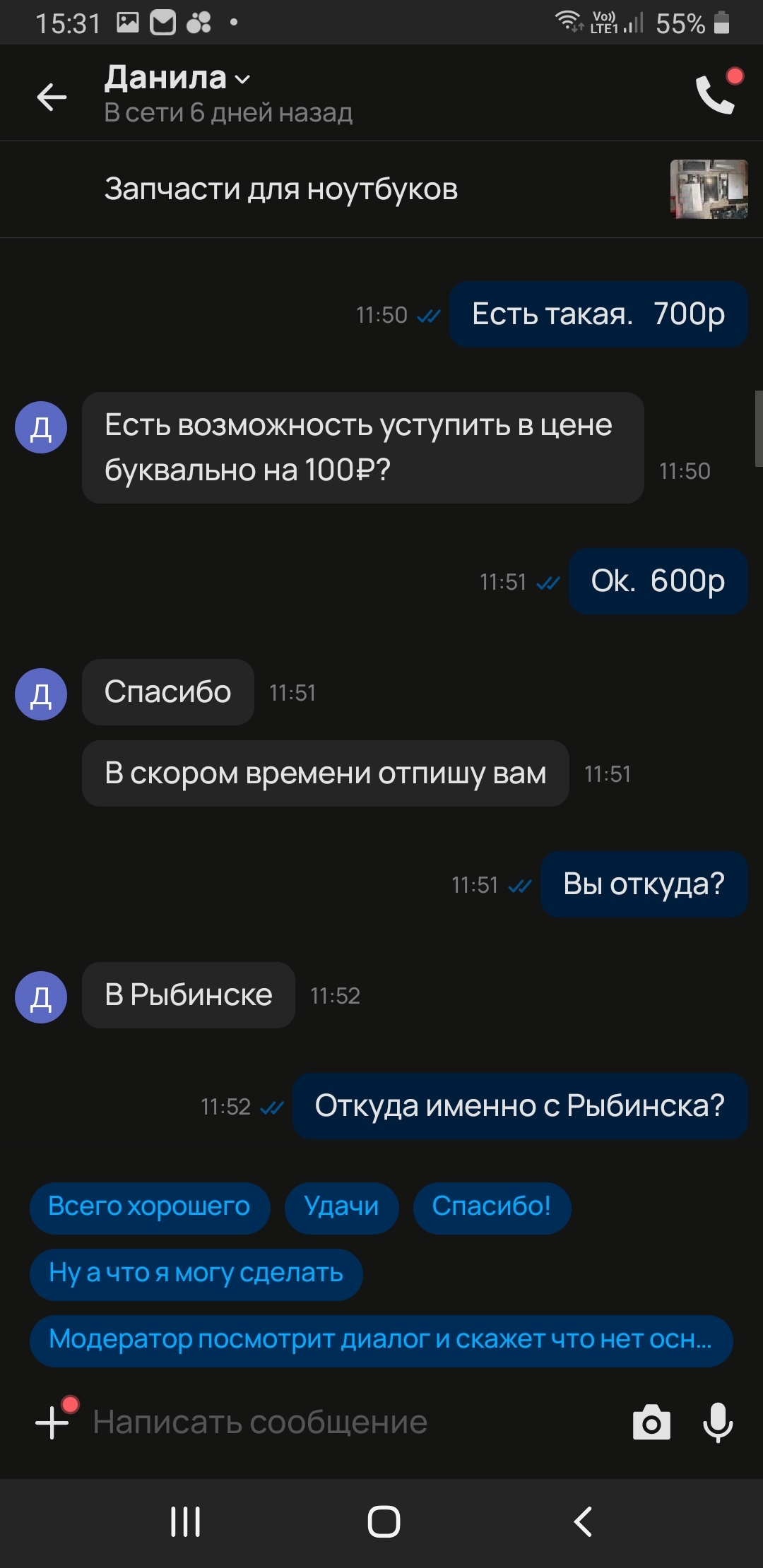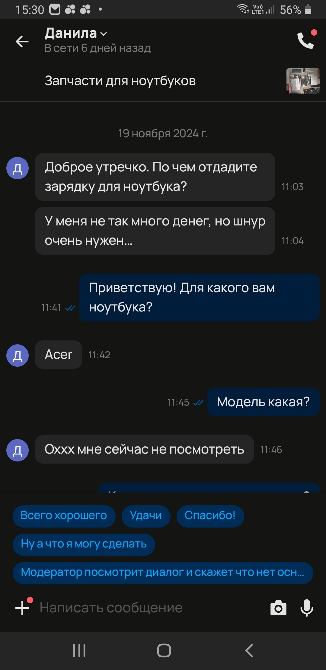 Уже не то авито что было раньше. Пытаясь достучаться до поддержки уже 4й раз ответа жду 6 дней а у них все по стандарту ,,ответа нет ожидайте,, Да и правила как сама поддержка разьяснила уже сменились не в пользу нормальных пользователей а в пользу продавцов-обманщиков. Если вы заказали товар авито доставкой и при осмотре в пункте выдачи понимаите что вас обманули и товар не соответствует заявленому даже если вы все это засняли на видео на телефон обьяснив причину отказа и указав в нем на камеру что товар утиль после чего оформив возрат, то не спишите радоваться так как по новым правилам теперь продавец а как в моем случии он был ,,обманьщиком,, который пытался продать тв плату под видом отличном состоянии 2011г за 4тр да еще и утиль так как даже текстолит на ней потемневший был! Дак вот теперь такие горе продавцы имеют полное право загадить ваш профель одной звездой с самым неготивным коментарием ,,Он не забрал товар,,! Ну да и это еще не все ! Приходит сообщения в авито (по обьявлению где ноуты распрадаються по частям) и пишет мне пользователь с таких слов: Нужна зарядка для ноутбука но денег мало! Я думаю че не помочь , Нашел я поисказ зарядник тот который ему был нужен но как зарядник б/у провод в одном месте был замотан изолентой ну я и цену ему скинул написав 700р , но наглость 2е счастье так как покупатель пишет : ,,скинь еще 100р,, естественно скинул и выслал фото зарядника написав при этом что провод перемотан изолентой и тут с него пошло..... ,,а почему изолента?,, ,мне на продажу для ноута нужна,, Ну я прочитав принял решения не продавать ему с изолентой тем болие для перепродажи он просил (мало ли что потом притензии начнуться что ноут спалил) Ну и как вы думаите? Естественно сделки не было а я получил 1 звезду и негативный отзыв! Вот так вот я хотел помочь человеку и найти ему зарядку хотя в обьявлении не было указано что я зарядки продаю но поддержка авито снова сказала что отзыв Справедлив! Так что убить ваш профель негативными отзывами теперь может не только мошеник да еще и человек которяй у вас не чего не купил! 10 лет все отзывы положительные а теперь по правелам авито пиши что хочешь и кто хочешь так как им плевать и разбераться они не будут пришлют отписку что отзыв не что не нарушает!