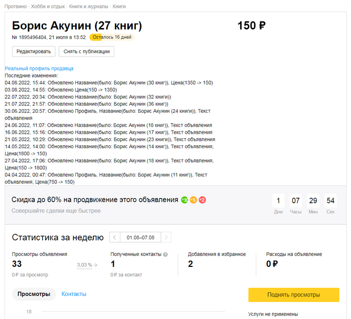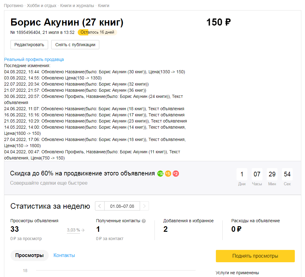 Я не сторонник каждый месяц клепать новые объявления, потому как они собирают больше просмотров (мне это не требуется)