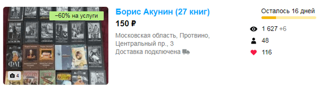 А еще самый прикол, что схема "можно выложить весь ассортимент отдельно" в книгах сработает негативно. Есть у меня серии, где больше 100 книг (тот же Конан), это покупателю как искать в моем аккаунте? Это просто долго, муторно, и неудобно. Потом просить меня объединить 18 книг в одну Авито.Доставку, а мне после совершения сделки искать и закрывать каждое объявление... В случае с аккаунтом жены, там куплен МАХ тариф, и там есть автозагрузка, поэтому ассортимент подтягивается из БД напрямую и всегда актуален.