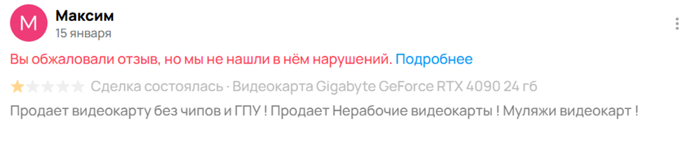 🔹Принять меры в связи с тем, что текст отзыва содержит обвинение меня в мошенничестве (продаже муляжей видеокарт под видом настоящих), что не соответствует фактам и нарушает п. 3 Правил Авито, а именно удалить отзыв либо перенести данный отзыв в категорию отзывов без оценки.