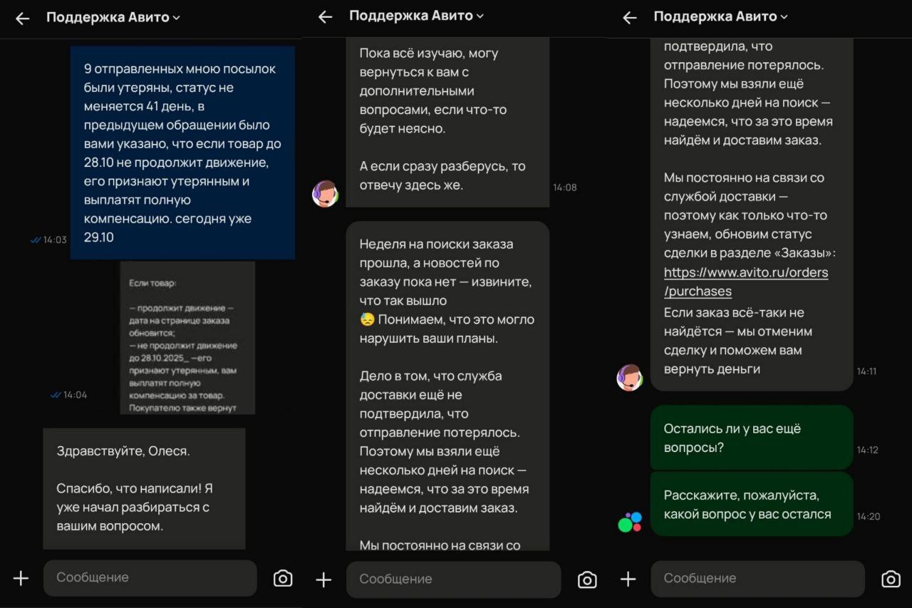 29.10.25 снова пишу в поддержку авито, потому что последний указанный ими срок на поиск посылок вышел день назад, а заявление на компенсацию до сих пор не появилось на странице заказа. Служба поддержки сообщает, что они "взяли еще несколько дней на поиск посылки". Нет никаких конкретных сроков, при том, что все предыдущие сроки были нарушены.