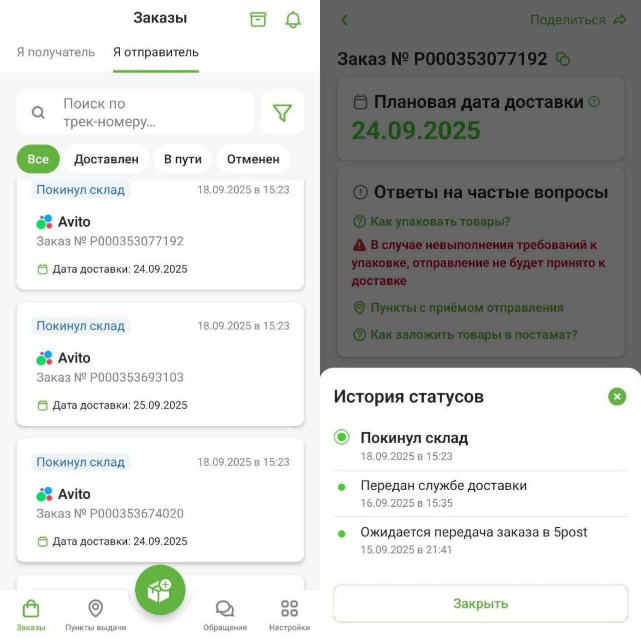 Мною были отправлены 9 посылок разным покупателям через сервис "Авито" службой доставки "5post". Все посылки были отправлены через один и тот же пункт приёма отправлений, и все потерялись на одном и том же этапе: статус у всех девяти посылок в приложении 5post не менялся с 18.09.25, при этом в приложении авито срок доставки увеличивался каждые пару дней.