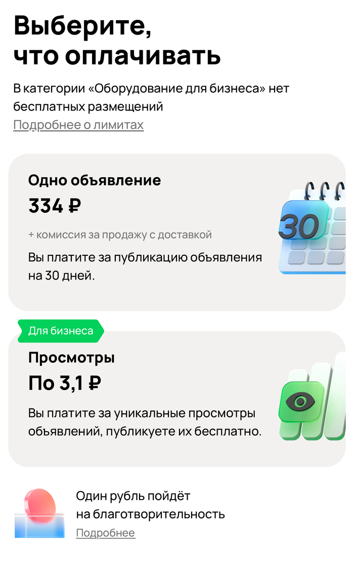 Дьявол конечно же в деталях крылся. И ведь на эту уловку не только я попался. Выше 1 скрин "в категории "товары для бизнеса" нет бесплатных объявлений", скрин 2 "просмотры всех объявлений в категориЯХ". То есть обычный пользователь может и не заменить, подумать что как указано на 1 скрине категория такая то, а по факту во получит оплату за просмотры ВСЕХ категориях, потому что все что вы выкладываете на авито (кроме услуг) будут относится к категории ТОВАРЫ. При этом авито где нужно выделяет слово в "Товарах", но только не тут! И это еще не мошенничество, это маленькая хитрость.
