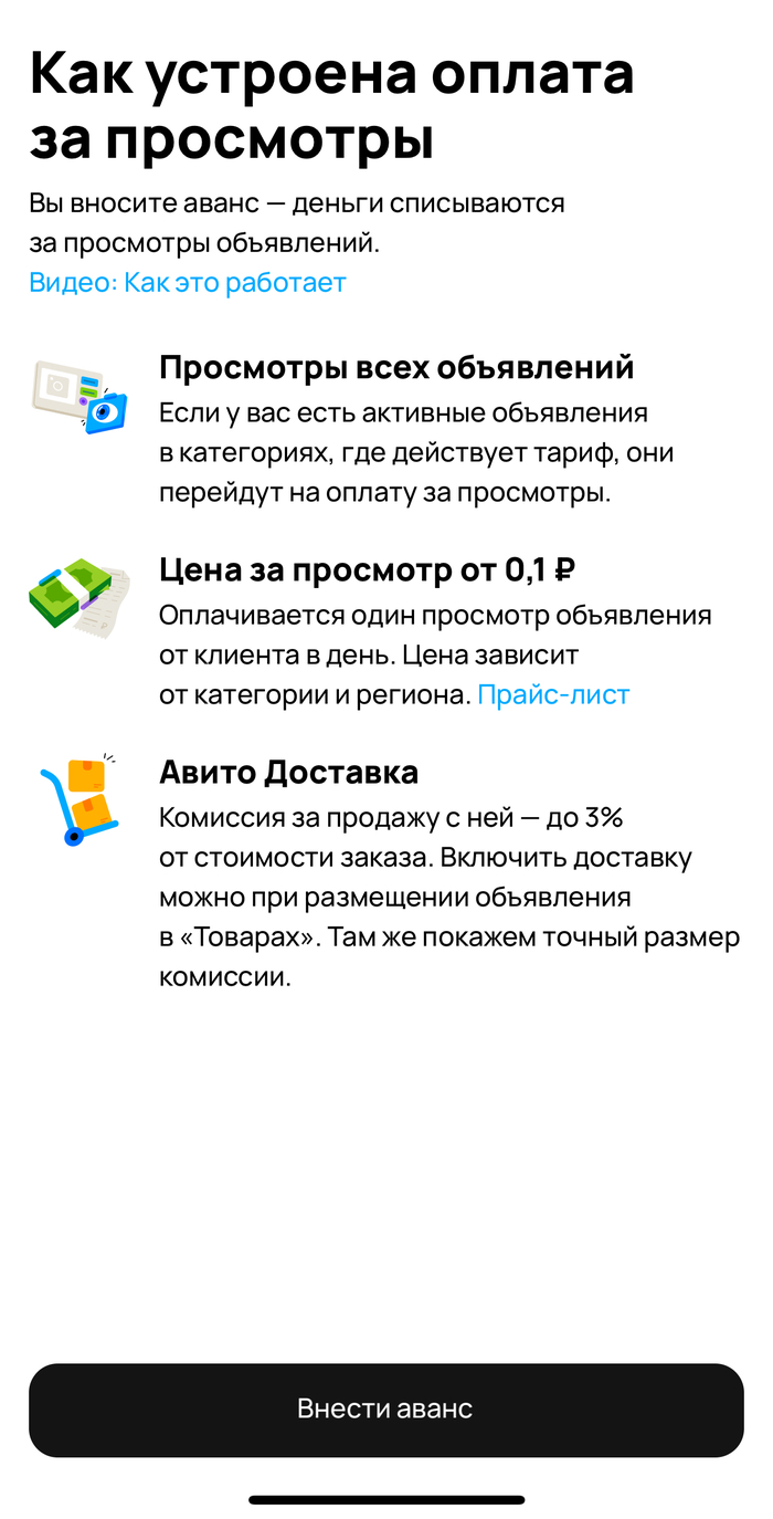 Товар 900, руб. размещение 334 руб., потом еще комиссия 63 руб. (7%) при продаже. То есть авито от моей вещи хочет 44% забрать. Нормально так! Но какие же они молодцы, предлагают тариф для бизнеса просмотры по 3,1 руб. (скрин сделан перед размещением поста, когда я делал объявление просмотр был от 0,9 руб). Товар не сильно просматриваемый, получалось бы за месяц просмотров 30-70 - что в пределах 100 руб за объявление. Далее просят внести аванс 600. Ну ок, не сгорит - потрачу на другие объявления. Вроде терпимо же. Но! Авито ж похлеще мошенников.