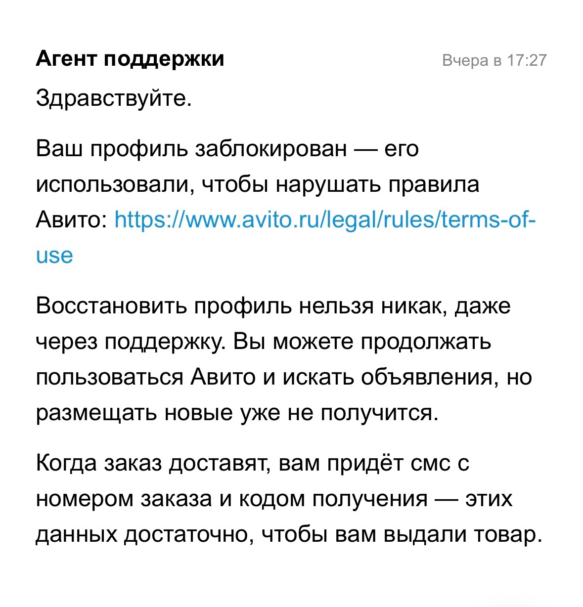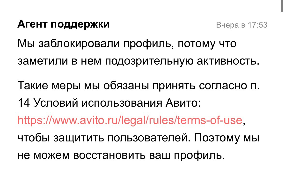 Продаю вещи на этой площадке с 2021 года. Имел 2 аккаунта, один для основных вещей, запасной для вещей подешевле и с нюансами. На основном аккаунте было 2700+ положительных отзывов и рейтинг 5.0, 5000+ успешных Авито доставок, 9000 подписчиков, постоянные клиенты а самое главное 2500+ активных объявлений и 8500+ в архиве. Всегда был уровень сервиса 100%, никаких жалоб и претензий. На втором аккаунте было около 300 продаж с Авито, 100 отзывов и 600 вещей наличия с архивом 300+. 27 декабря мне прилетает бан на запасной аккаунт, причины Авито конечно не называет ссылаясь на то что избегают потом обхода их правил. Я писал очень долго, звонил и все в этом роде. Через 30 дней удалились все мои объявления с архива и наличия. Остался голый аккаунт. В отчаянии я собрал все вещи и убрал в мешки. Начал работать еще больше на основном аккаунте, выкладывать больше вещей и еще лучше. Делал описания, везде писал замеры. 25 апреля меня выкидывает с аккаунта, пока я писал описание к обновлению и блокируют. Я звоню на горячую линию, говорю мол какая-то ошибка. Девушка по горячей линии отвечает, что ответит на почту и сбрасывает. На почту приходит письмо, что я якобы сам отключил тариф. Авито отключили мне тариф и не давали сутки зайти на аккаунт. Мне писали люди, делали заказы, нужно было выводить средства и отправлять. Они убрали все мои отзывы и ограничили доступ ко всем прикрепленным аккаунтам. Потом я дописался чтоб хоть отзывы вернули. В тп ничего не отвечают по существу, хоть пиши хоть звони. Те кто со мной знаком знают, как я трепетно отношусь к вещам и тщательно ухаживаю за ними. Все вещи постираны, отглажены. На каждой я убираю катышки и торчащие ниточки, раскладываю по контейнерам закрытым, чтоб не пылилось. Аккуратно упаковываю, за что и имею такое большое количество отзывов. В надежде, что Авито это мой шанс, я бросил работу. Все это к тому, друзья и коллеги, что развиваете телеграмм, развивайте вк, продавайте на других площадках, барахолках. Иначе одним днем вам все обрубят и вы останетесь с голой жопой. Как понимаете там был мой тариф, мои паспортные данные. Создать я новый аккаунт не могу, так как и получить тариф. По итогу я с целой квартирой вещей остался. В наличии было, считая обновления около 2600, так же в мешках в запасе лежит еще около 4000 позиций. Через месяц мне удалят мои 4 года трудов, исчезнут все мои объявления. Так же на прикрепленных аккаунтах висят заказы, которые я купил, так же были баллы для покупок. Вот такая вот всеми нами любимая площадка Авито. Ниже фото общения с тп авито и с вещами я из наличия, которые надо куда-то деть, это не считая закрытых мешков которых еще больше)