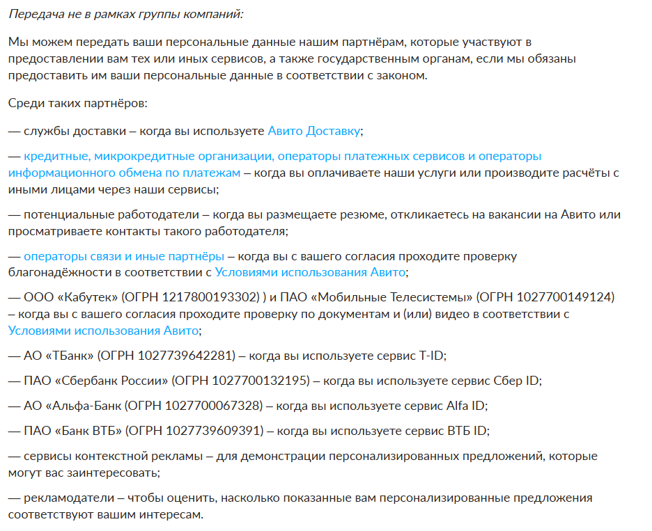 Авито и не скрывает, что передает мои данные Паспорт+ моё видео, Микрокредитным организациям. Мало того, что список большеват, потом ищи концы? А так же не изветсно когда и как этот список менялся и где предыдущие варианты этого списка?