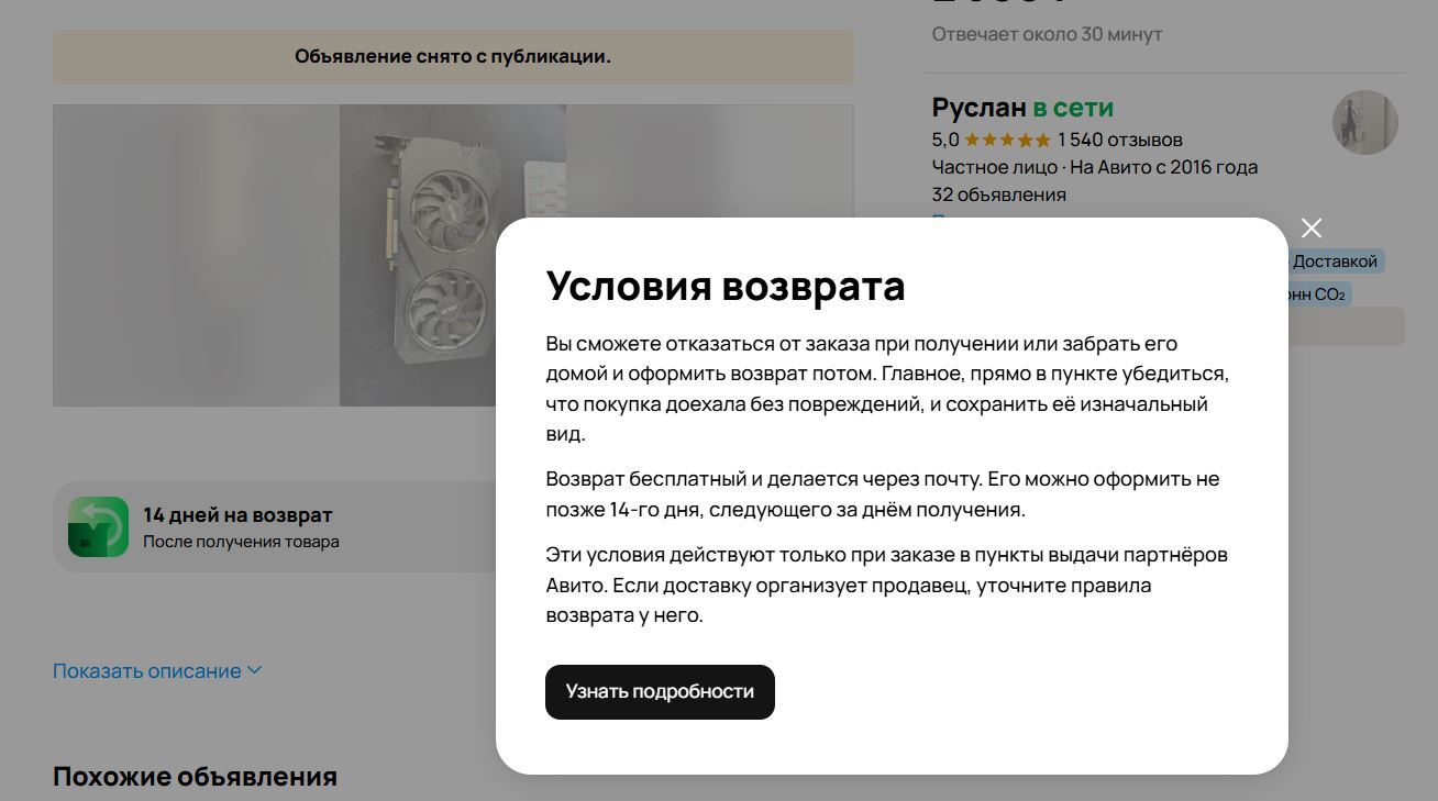 Решил себе и хорошему знакомому обновить добавить видеокарты в свои ПК*шники. Полноценные видеокарты нет возможности купить, да и не игроманы совсем - сидим на встроенных в процессор видео уже давным-давно. Посмотрели варианты и выбрали тот который давал гарантию проверки 14 суток...именно этот пункт был в приоритете. Без проверки другие варианты в принципе не рассматривали. Пара штук майнинг видеокарт... риск очевиден. В корзине Авито было написано, что в случае проблемы с одним товаром - вернуть придется весь заказ. Никаких других уведомлений. Продавец же сам четко подтвердил гарантию в 14 суток.