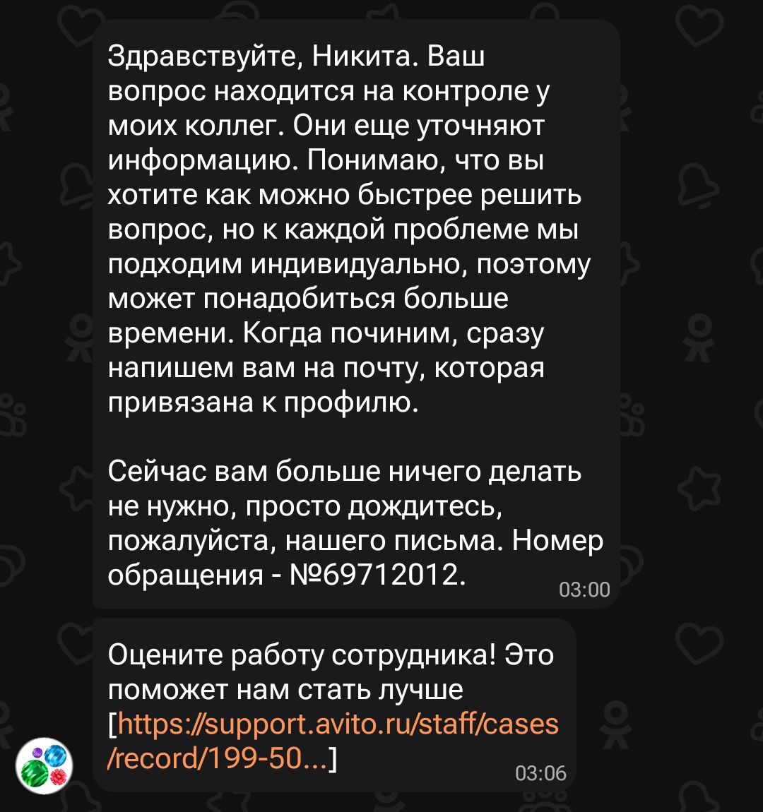 Авито прошу разблокировать мне аккаунт и подтянуть уровень поддержки до высокого уровня