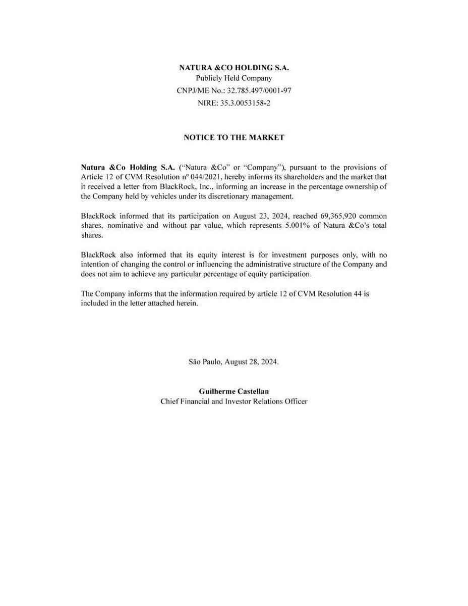 С 2021 года корпорация Blackrock является акционером, способным оказывать влияние на управление бизнесом Natura&Сo. В августе 2024 года Blackrock приобретает акции Natura&Сo на сумму порядка $360 млн. Стратегическая сделка свидетельствует об уверенности в рыночном потенциале компании и заключается вскоре после банкротства Avon в США.