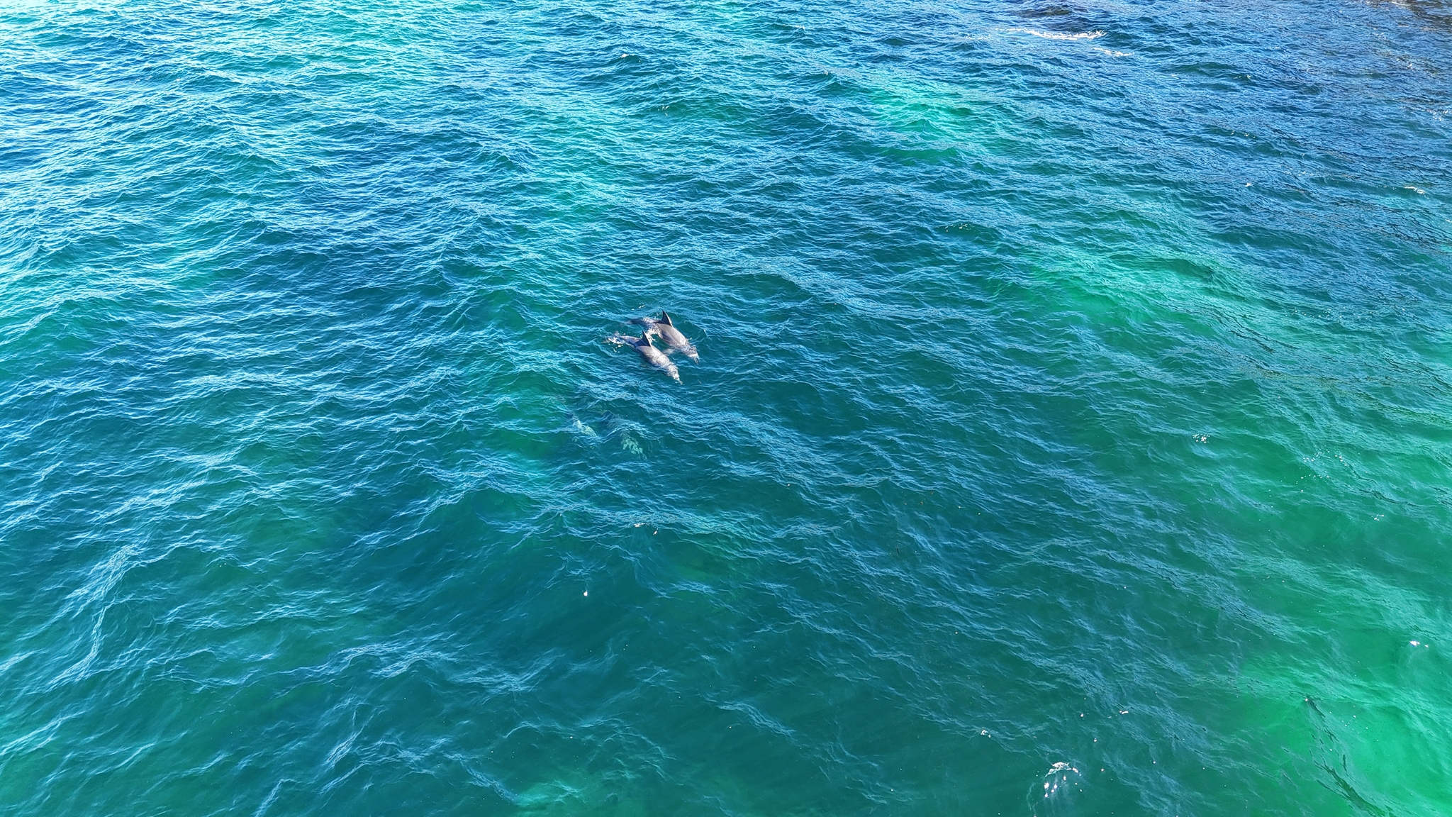 Дельфины! Целая группа! Благодаря дрону удалось заснять эту компашку, хотя и яркое солнце ограничивало съёмку.