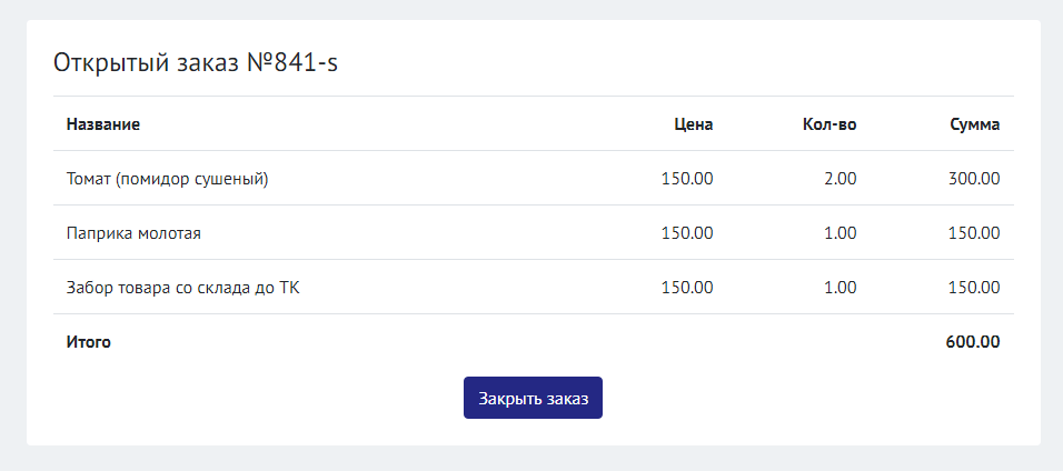 В корзине у дилера появляется открытый счет и он может продолжить резервировать товары, пополняя этот открытый счет. Когда дилер планирует оплачивать и забирать товар, то нажимает на кнопку «Закрыть заказ» и в программе происходит выделение этого счета. Таким образом менеджер получает сигнал для согласования оплаты и передачи заказа на сборку на склад.