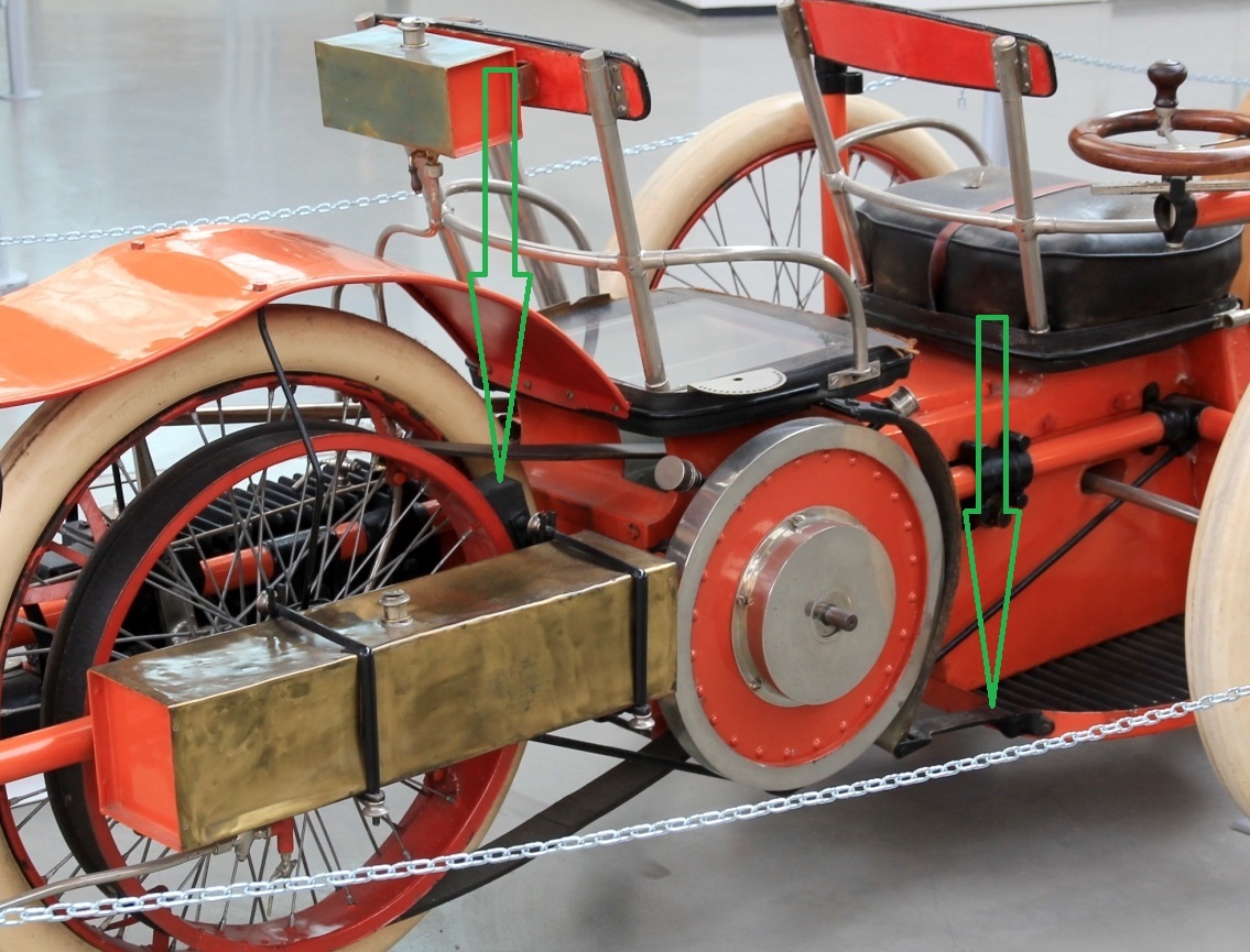 Заднее колесо приводилось во вращение плоским ремнём.Обычно ремень был в свободном состоянии, проскальзывал, получалась нейтральная передача. Ставили ещё дополнительный натяжной ролик, который его натягивал, и тогда автомобиль двигался вперёд. «Но это не наш метод», — сказал Леон — «У меня будет отодвигаться целиком заднее колесо». Вот слева видите рычаг: при его движении вперёд заднее колесо отодвигалось назад, ремень натягивался, автомобиль ехал; при движении рычага назад заднее колесо уходило вперёд, ремень проскальзывал, получалась нейтральная передача.