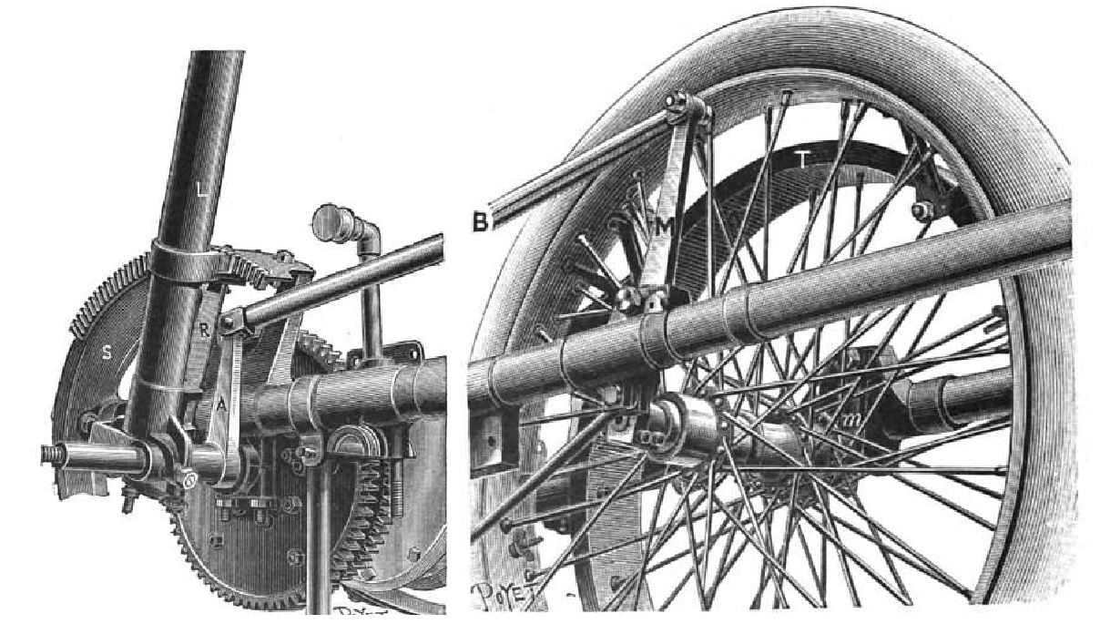 Вот на этом рисунке видно, что задняя ось закреплена на рычаге М, который мог перемещаться относительно рамы, и тяга В шла к основному главному рычагу управления. Когда колесо отодвигалось максимально вперёд, шкив его ременной передачи упирался в тормозной башмак.