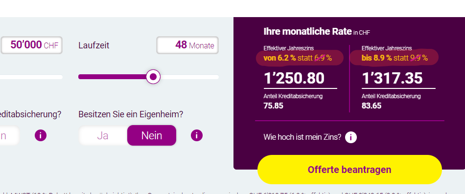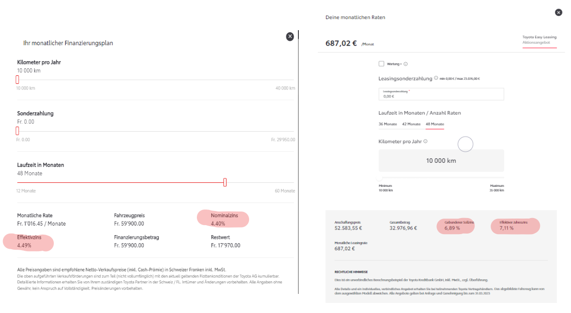 Процентная ставка плавает в зависимости от кредитной организации. В среднем номинальная процентная ставка составляет сейчас примерно от 3% до 6%, что несколько ниже, чем в Германии. Для сравнения возьму пример той же Тойоты с их оф.сайта ((Швейцария слева, Германия справа). Заодно тут можно посмотреть пример лизингового расчёта в обеих странах при условии: