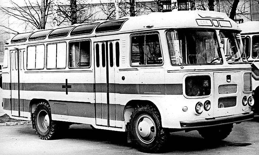 Массовый 23-местный автобус ПАЗ-672 вагонной компоновки с несущим цельнометаллическим кузовом и двумя складными дверями был создан в 1968 году Павловским заводом на агрегатах и узлах 115-сильного грузовика ГАЗ-53А. С 1970-го он ограниченно применялся в Советской армии как передвижной пункт забора крови с двумя раздельными кабинетами для персонала из 12 человек и пункт начальника штаба Гражданской обороны.