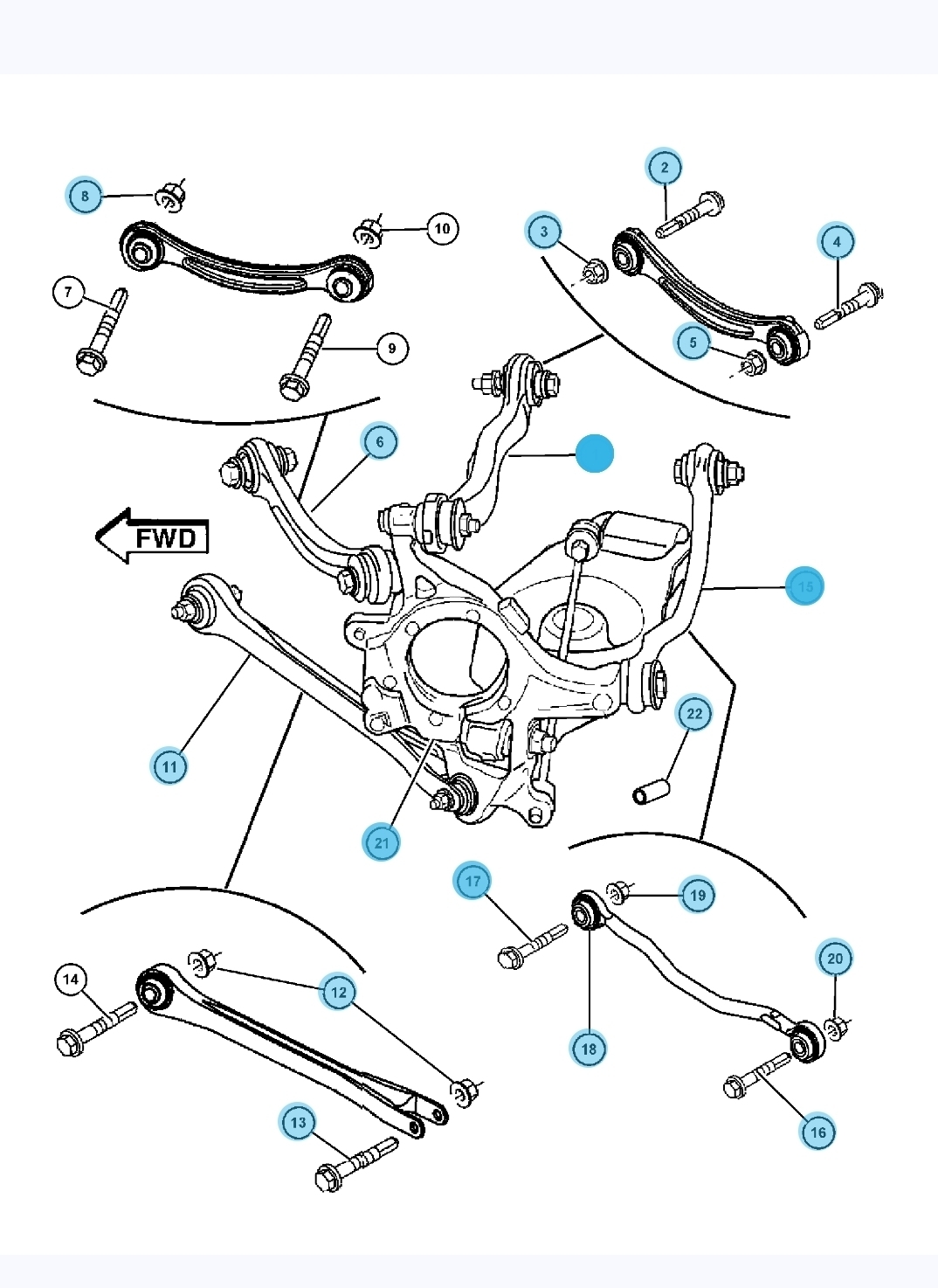 На картинке типичная схема, ее любит мерседес. 5 рычагов, нижний несущий, два верхних направляющих, спереди продольная реактивная тяга, помогающая воспринимать крутящий момент, сзади рулевой рычаг, которым регулируется базовое схождение и который отвечает за изменение схождения при работе подвески.
