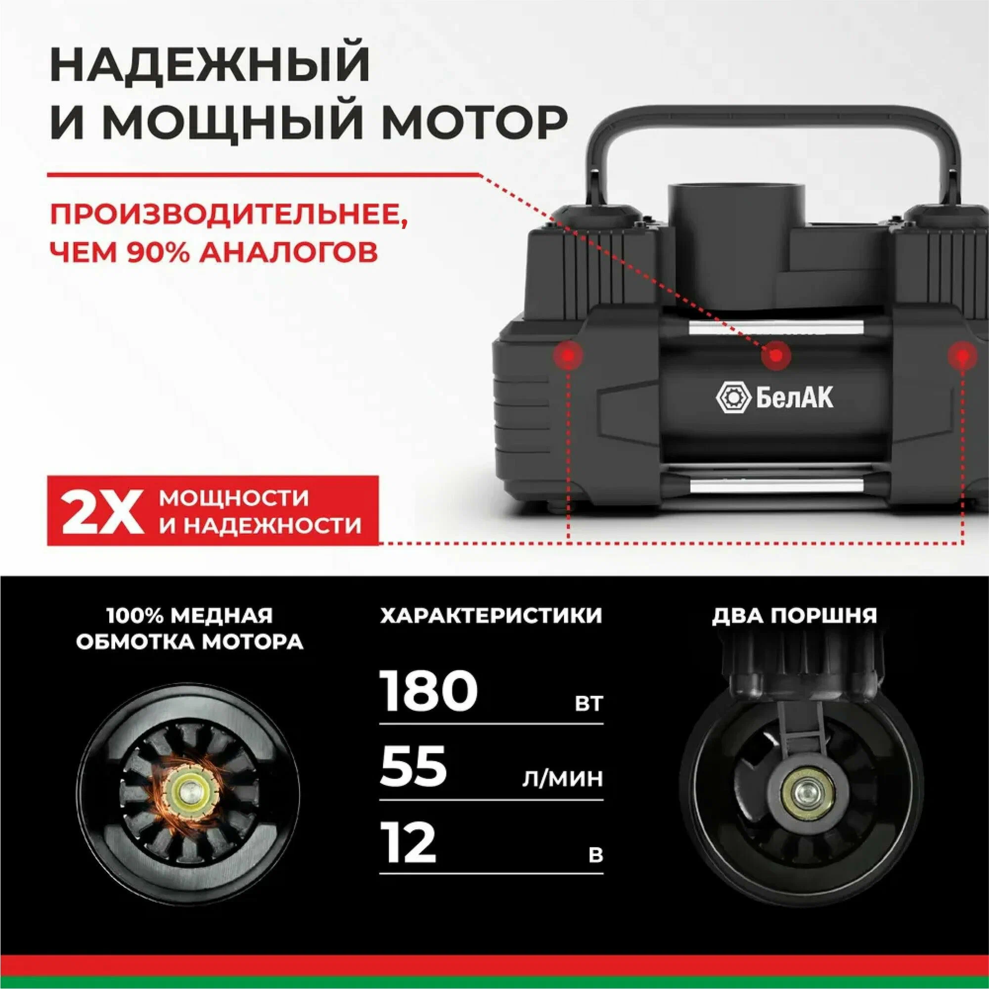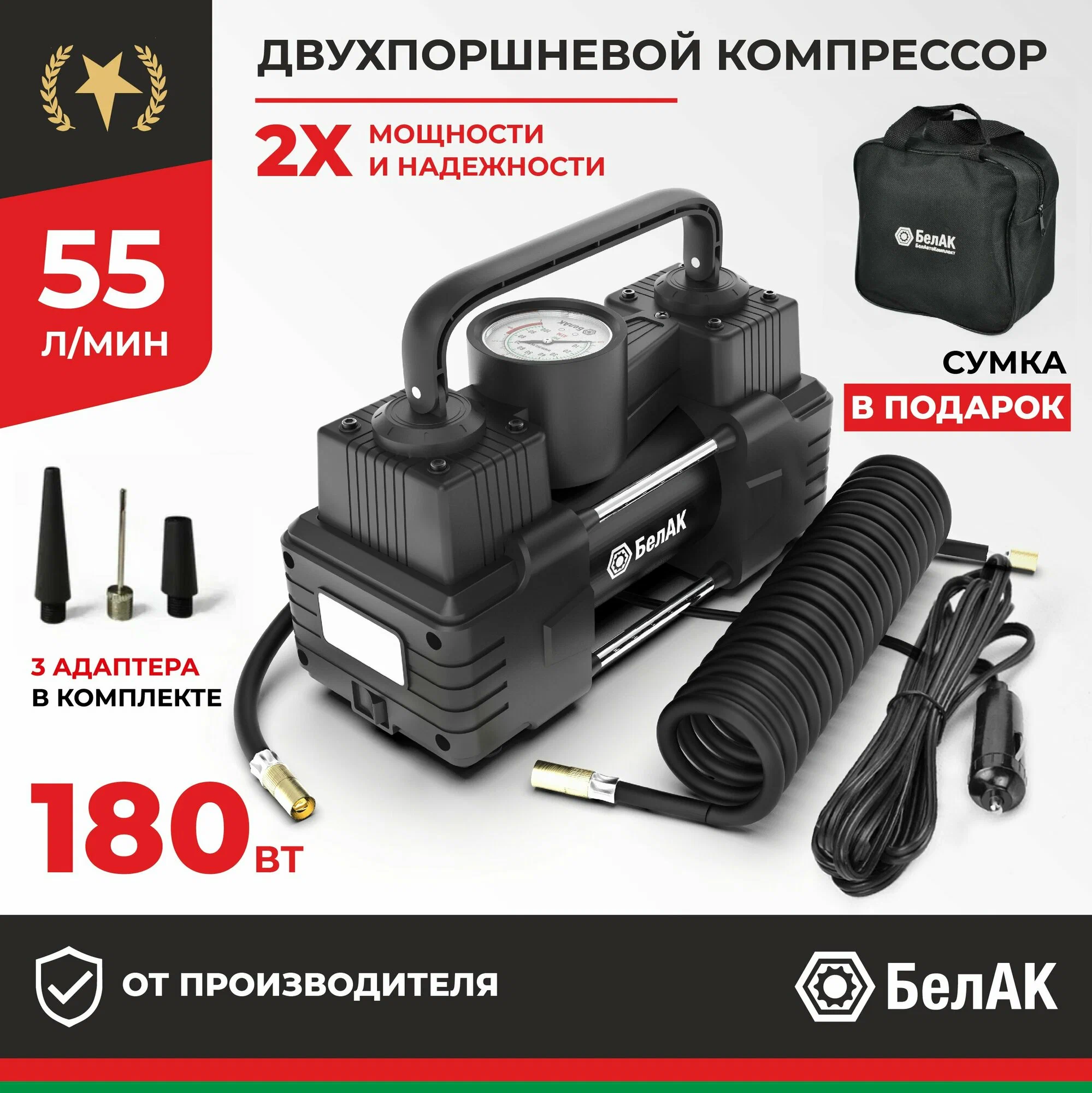 Производительность: до 55 литров воздуха в минуту, что позволяет быстро накачать шины автомобиля любого размера.